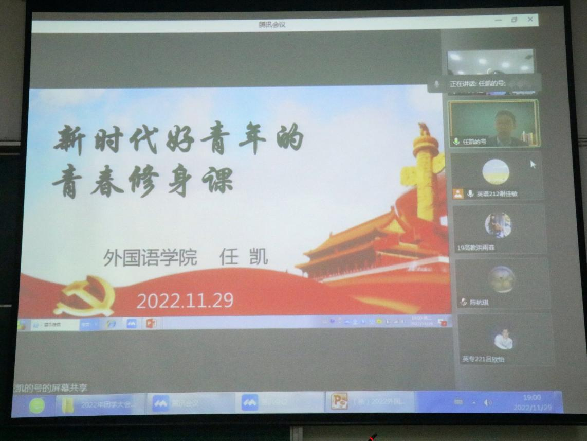 会上,任凯老师面向全体学生干部进行了党的二十大精神宣讲。他以“新时代好青年的青春修身课”为主题,围绕习近平总书记在党的二十大报告中对青年寄予的期望进行了阐释,分享了烈士陈祥榕、最美奋斗者黄文秀、红旗渠青年突击队、传奇女校长张桂梅等优秀青年的光荣事迹,鼓励学生干部要以志为先、以学为基、以践为实、以情为本开展修身,把个人成长融入到中国梦的进程中去,不断增强自身本领建设,以实际行动争做有理想、敢担当、能吃苦、肯奋斗的新时代好青年。
