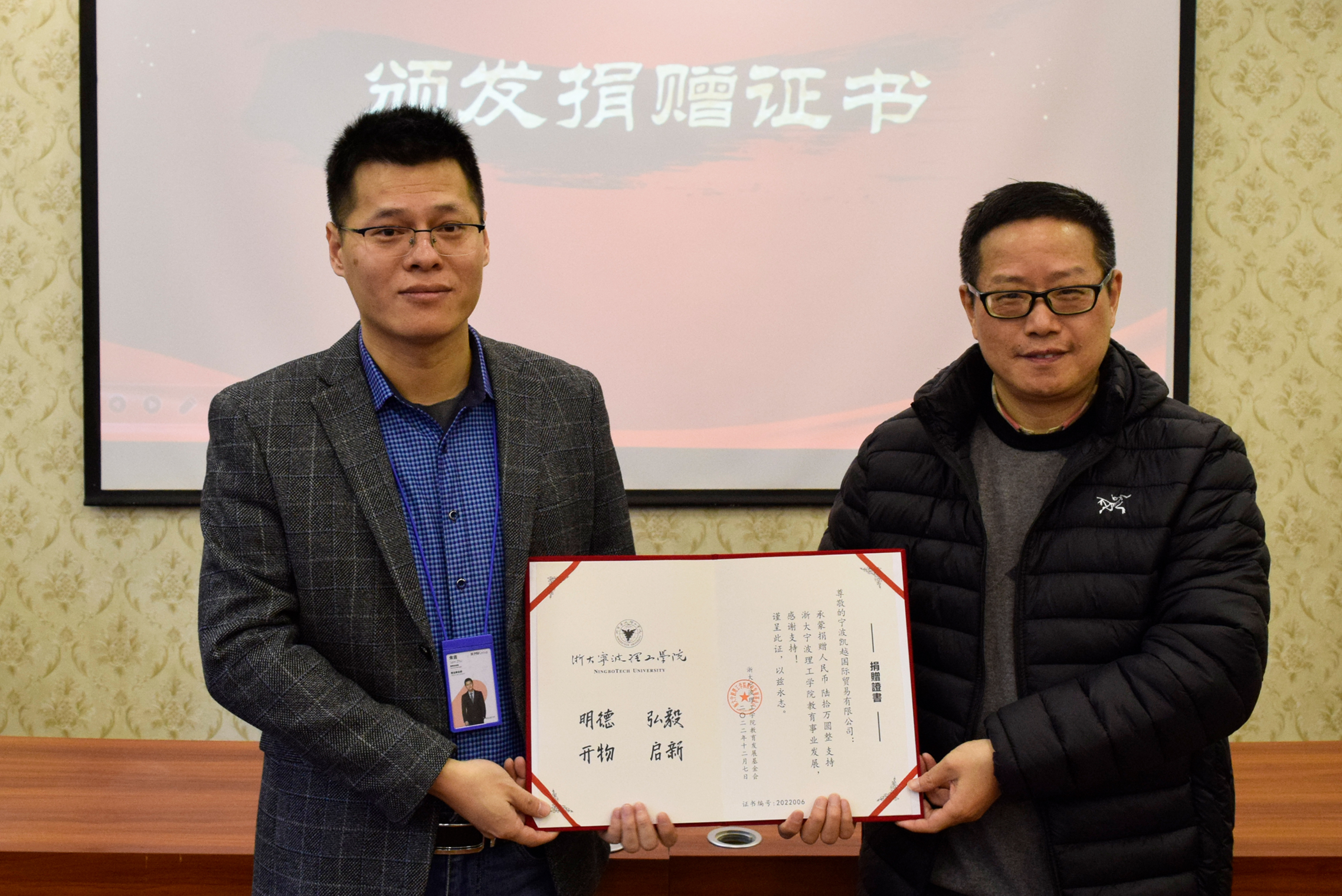 在捐赠仪式上,鲁东明首先对宁波凯越集团一行的到来表示欢迎,对“凯越”基金的捐赠表示感谢。他从办学条件、办学目标、人才培养等方面介绍了学校的基本概况,希望以本次“凯越”基金捐赠为契机,双方在专业技术领域和学生就业方面深入合作,推动产学研深度融合,同时他也鼓励在座的同学们,要以优秀校友为榜样,勤奋进取,奉献社会。
