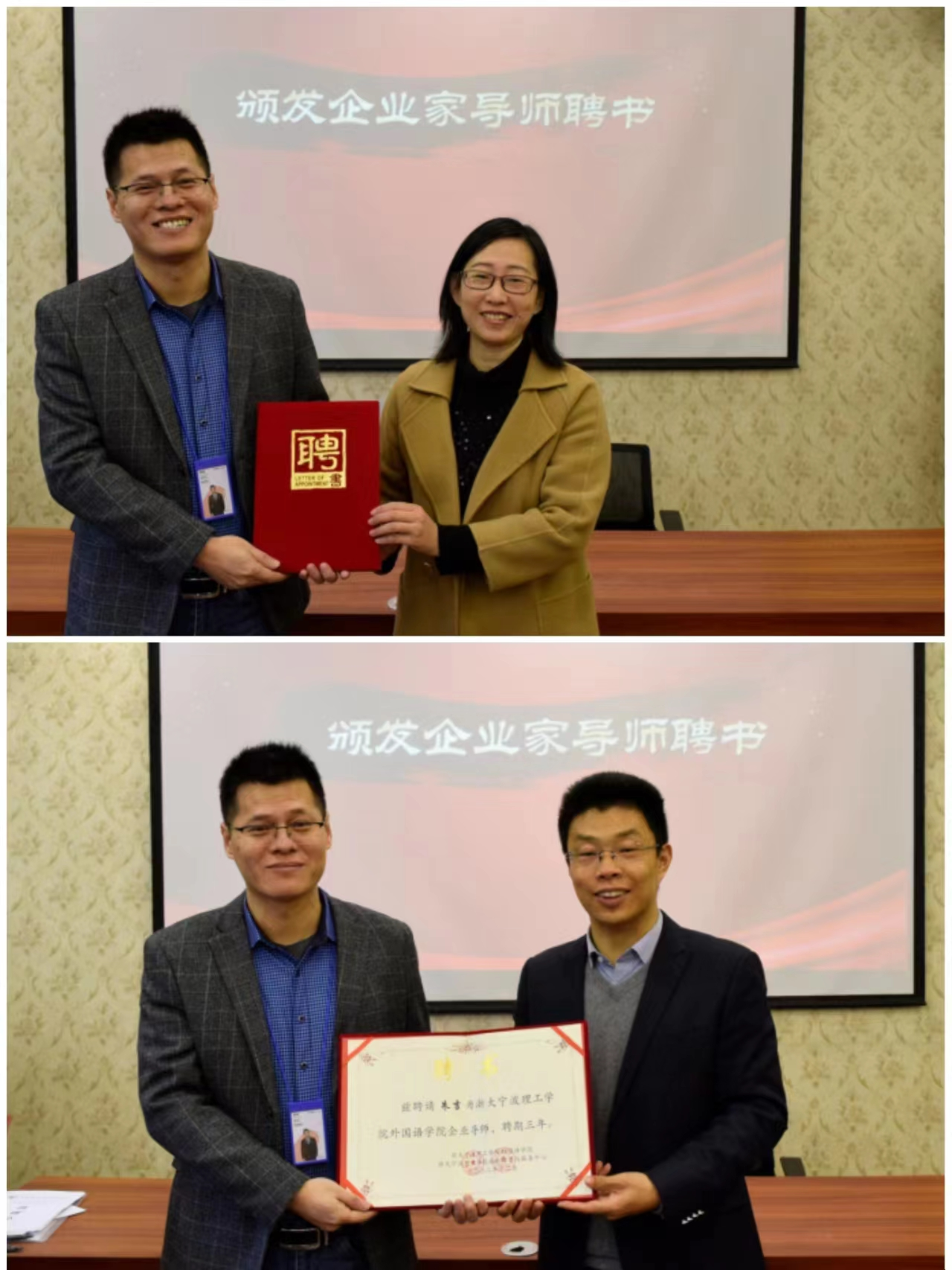 任凯和吴琼分别为朱吉、梅廷、李俊颁发企业家导师和校友导师聘任证书。