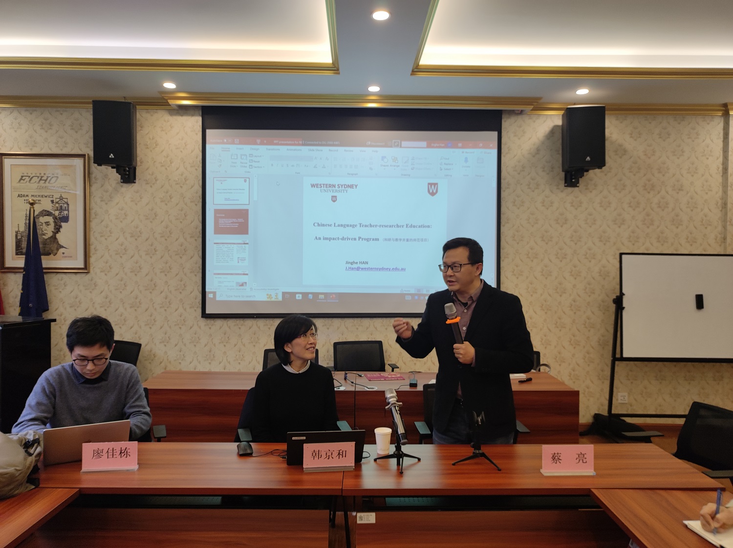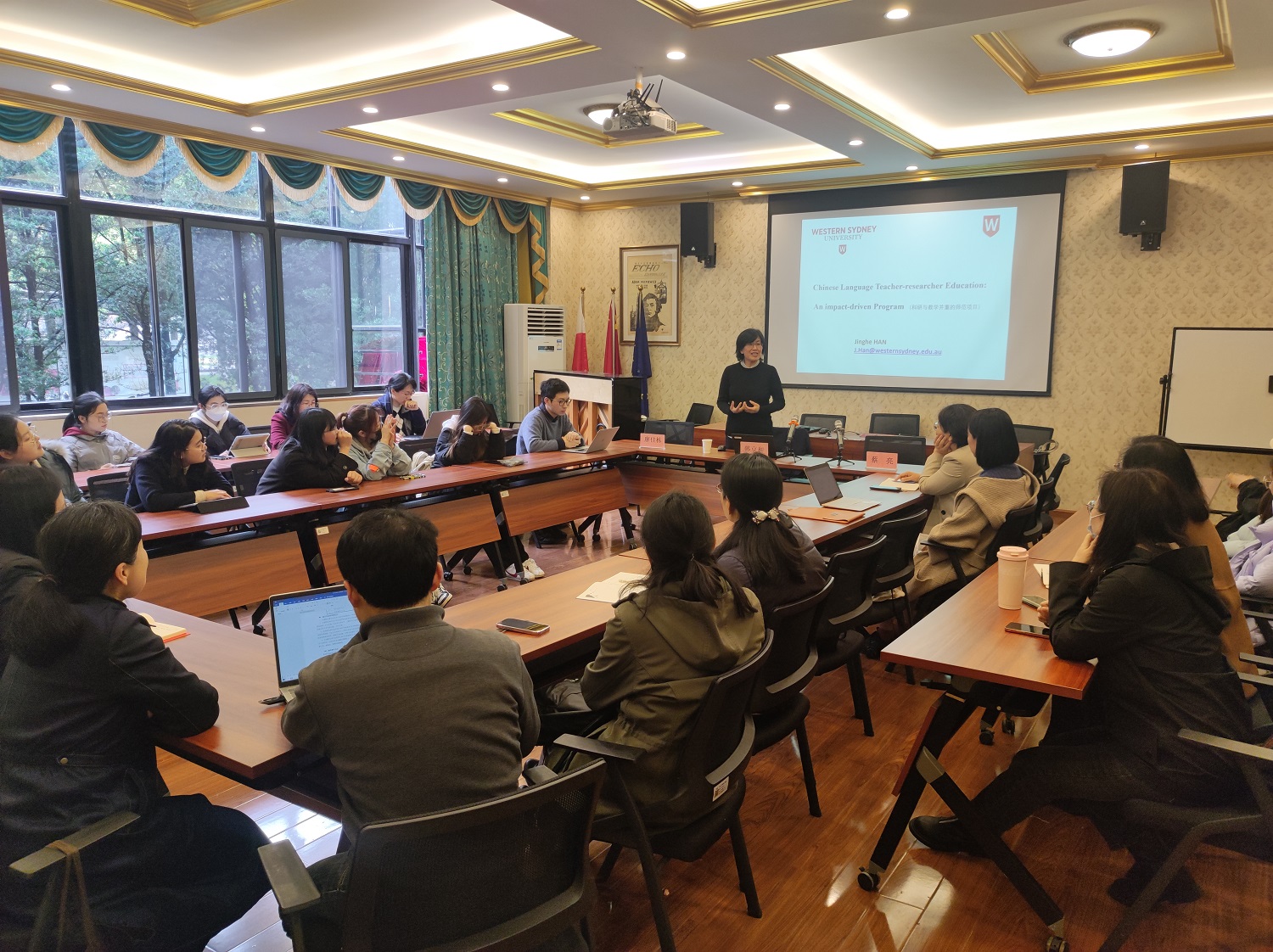 为了加强国际汉语教学水平,推动学院国际汉语教学工作,3月30日下午,外国语学院邀请了澳大利亚西悉尼大学教育学院副院长韩京和教授,在波兰研究中心SC107举办了一场题为“Chinese Language Teacher-research Education: An impact-driven Program的学术讲座,这也是学院随园讲坛的第57期活动。