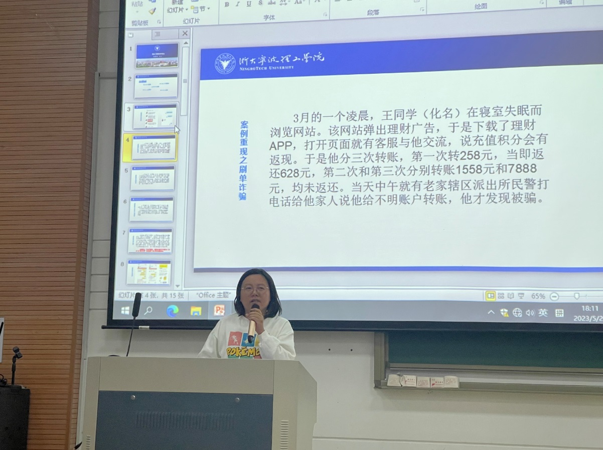 为进一步提高广大学生对电信网络诈骗的鉴别能力和防诈意识,预防校园电信网络诈骗案件的发生,切实维护同学们的利益,5月24日晚,外国语学院特邀学校保卫处李珍老师在SB102教室为全体大一到大三同学开展了防电信诈骗安全教育,学院思政主管芦美丽、思政副主管阮佳蒂、团委副书记洪雨菲参加了讲座。