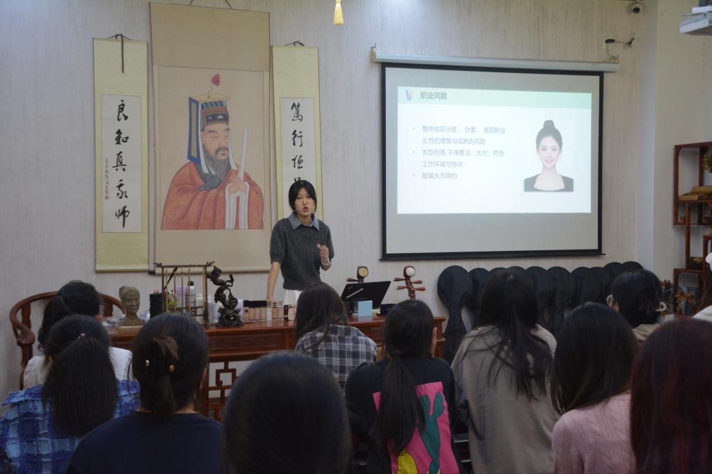 课堂上,姚叶青老师从整体妆容、发型和服装三个方面说明了职业化妆原则,并通过现场化妆演示讲解的形式指导学员求职面试妆及整体形象设计等实用化妆技巧。