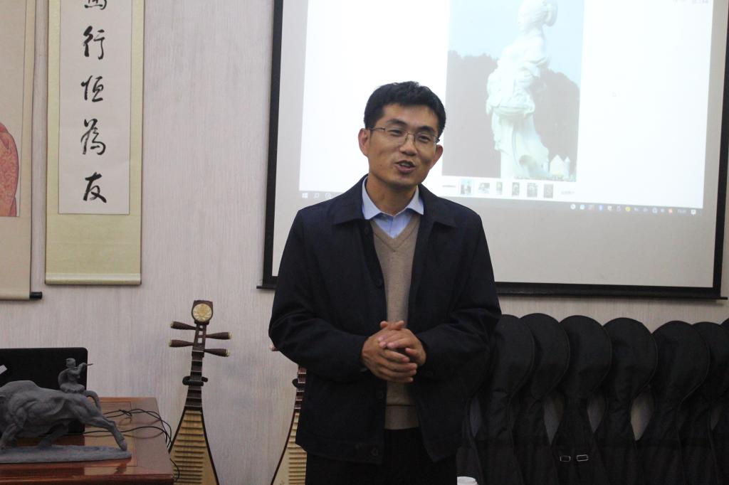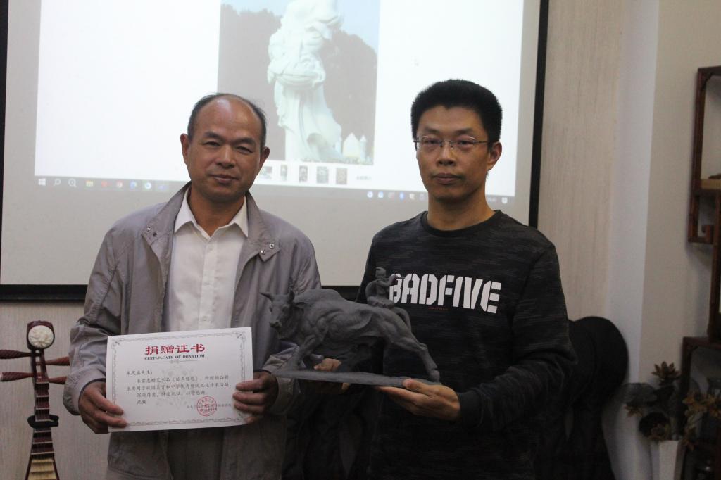 学校团委书记周春晓老师,外国语学院党委副书记、纪委书记任凯老师,外国语学院思政主管芦美丽老师和主讲老师朱茂盛、黄小华参加了开班仪式,活动由英语232班蔡利君同学主持。开班仪式上,学校团委书记周春晓老师肯定了前两期“博雅课堂”泥塑班的开班效果,希望同学们在这次博雅课堂中有所成长。主讲老师朱茂盛向学校赠送了他的泥塑作品《笛声悠悠》,并与黄小华老师一同介绍作品的创作背景、特点等,随后,外国语学院党委副书记任凯老师为朱老师颁发了捐赠证书。