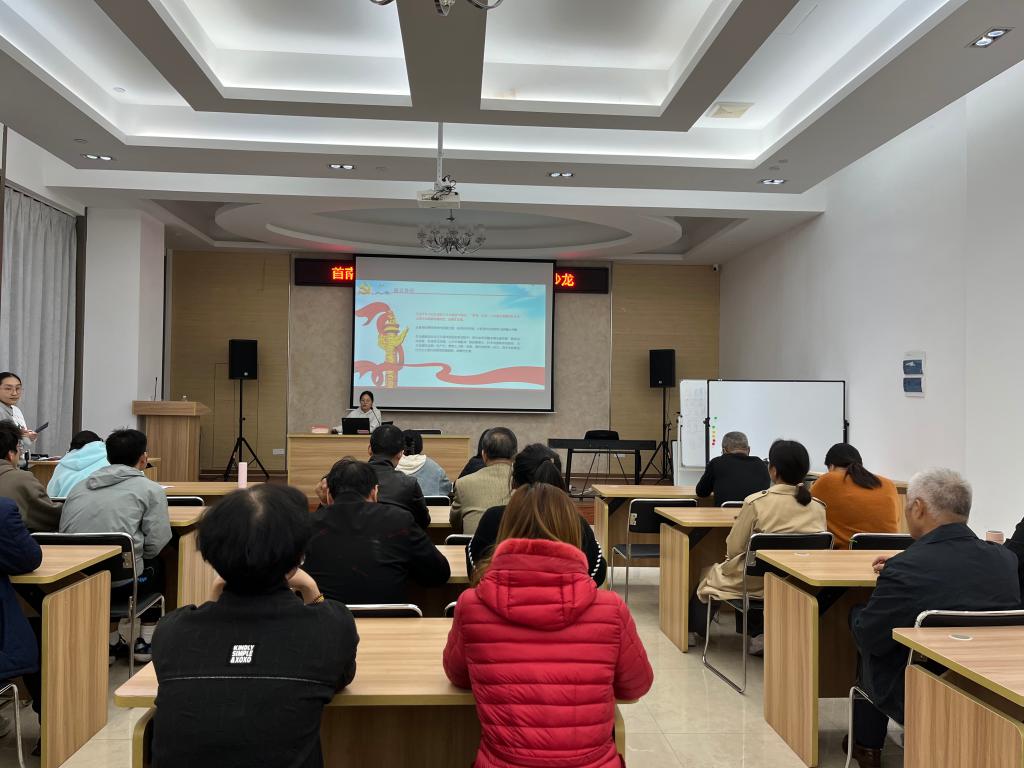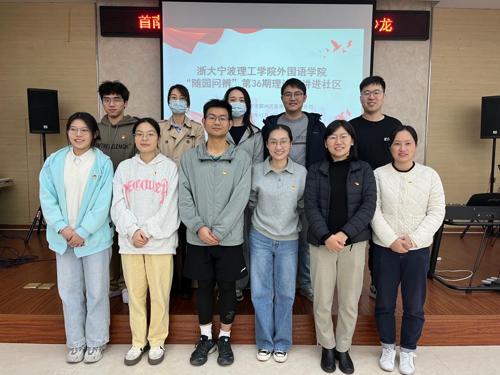 11月27日晚,外国语学院大学生理论宣讲团的3位宣讲员在指导老师芦美丽的带领下,前往宁波市鄞州区首南街道日丽社区开展“随园问辨”第36期理论宣讲活动。丽日社区党支部书记汪鸿和社区20余名党员群众参加了活动。活动由英语222班项毅铖同学主持。