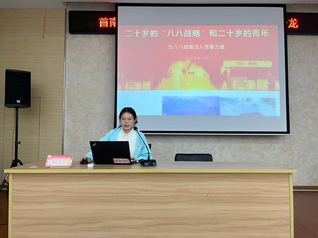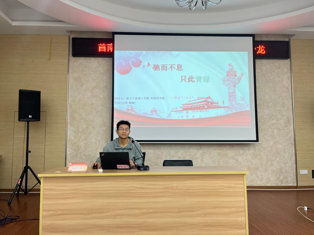 来自英语202班的宣讲员王灏蕴同学围绕“教育、科技、人才”这一主题进行宣讲。习近平总书记在党的二十大报告中指出“教育、科技、人才是全面建设社会主义现代化国家的基础性、战略性支撑”,王灏蕴分别从三者的辩证统一关系、重要意义以及如何做好这项工作进行了介绍。日语211班宣讲员滕明起同学以《二十岁的“八八战略”和二十岁的青年》为题,详细介绍了“八八战略”的主要内容,并通过丽水景宁、宁波梅山新区、安吉县下姜村三个典型案例,生动介绍了“八八战略”取得的成果,并从中总结青年大学生该如何践行“八八战略”。英语222班宣讲员姚涵同学以《驰而不息 只此青绿》为题对新时代我国在环保领域开展的措施、取得的成效进行了宣讲,并号召社区党员群众开展低碳减排活动,倡导绿色生活人人参与,为我国环保事业贡献自己的力量。