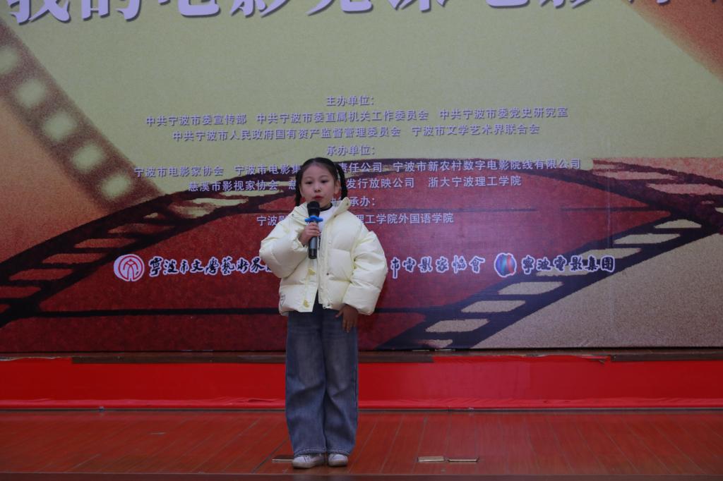 颁奖现场,来自浙大宁波理工学院、宁波市翰香小学、宁海海亮高级中学等获奖选手进行了影评宣讲展演。“今天爸爸带我看了《长安三万里》,作为一个历史迷,我看了电影感触非常深。这部影片通过老年高适的回忆,让我们认识了豪迈的李白、佛系的王维、开朗的杜甫。”来自宁波市翰香小学年仅8岁的吴幼琳第一个出场全程脱稿演示了《长安三万里》影评;来自浙大宁波理工学院外国语学院英语213班的许铖菲结合专业,用双语的形式对电影《流浪地球2》进行影评展示,赢得了观众阵阵掌声。