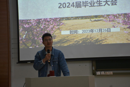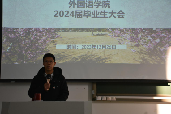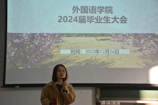 12月26日下午,外国语学院召开2024届毕业生大会,外国语学院党委书记刘群娣、乐歌人体工学股份有限公司招聘主管陈莉、学校团委刘笑成、英语系主任助理罗贤娴、2019级校友王昊、学工办辅导员、毕业班班导师等出席会议,会议由学院党委副书记任凯主持。
