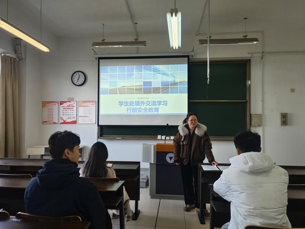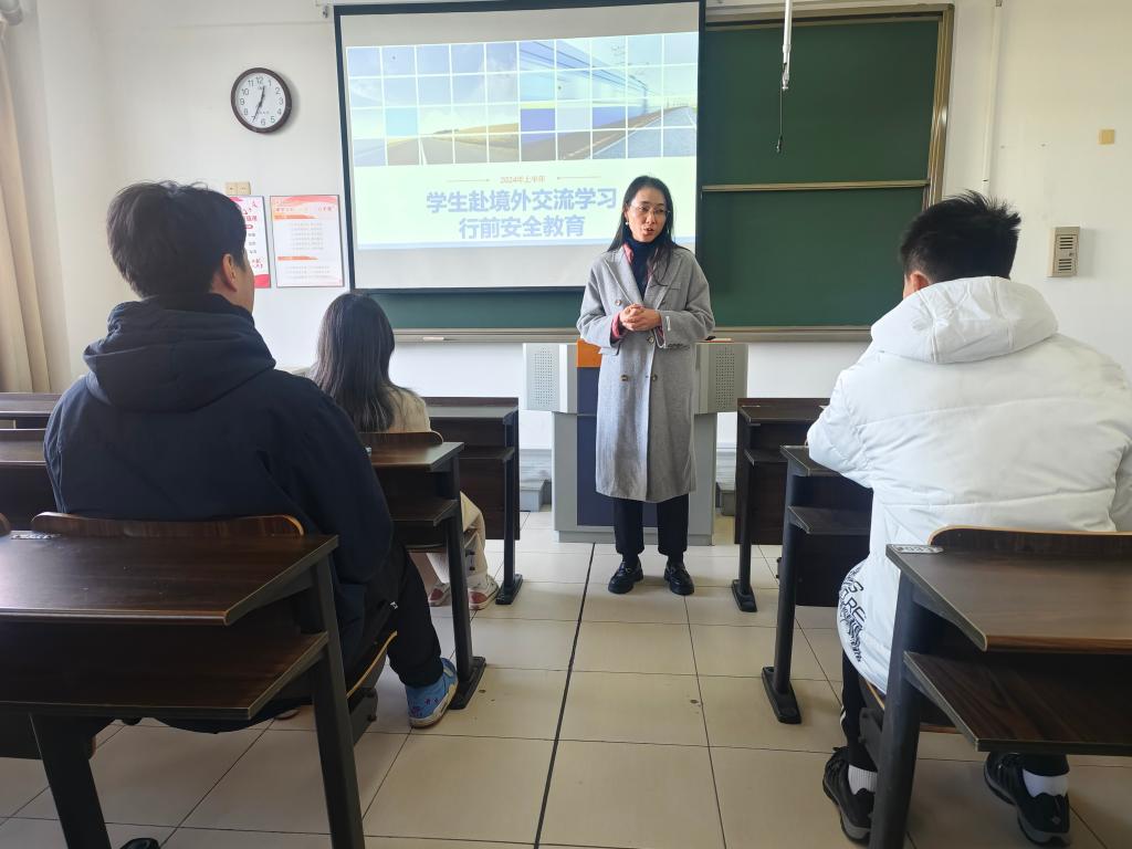 2024年1月12日下午,外国语学院于SC406召开了2024年上半年学生赴境外交流行前安全教育会议,学院院长助理林晶晶老师、外事秘书赵远老师,以及拟赴新西兰坎特伯雷大学、波兰波兹南密兹凯维奇大学访学交流的三位同学参会。