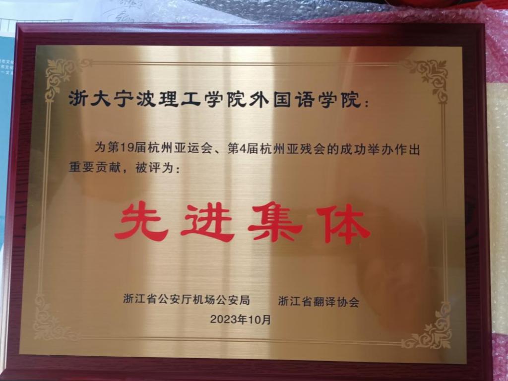 寒假期间传来一份喜报,由于外国语学院教师团队在服务第19届亚运会、第4届杭州亚残会的工作中做出重要贡献,被浙江公安厅机场公安局、浙江省翻译协会授予“先进集体”荣誉称号。