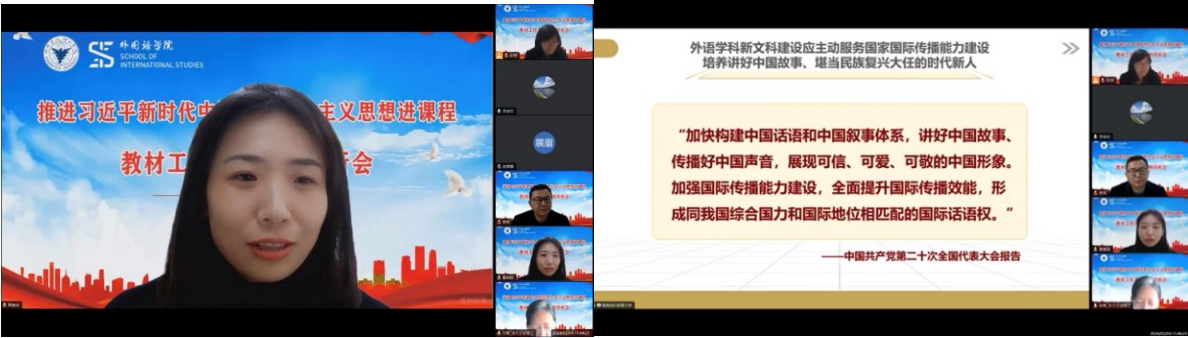 为深入贯彻习近平总书记关于教育的重要论述,进一步推进习近平新时代中国特色社会主义思想“进高校、进教材、进课堂”,全面落实立德树人根本任务,外国语学院于2024年3月4日在线上召开了推进习近平新时代中国特色社会主义思想进课程教材工作典型案例评析会。此次会议邀请到了邯郸学院魏晓红教授、外研社高等营销中心总监助理翟嘉琪女士做案例评析和经验分享。外国语学院主要领导、系部负责人、基层教学组织负责人、思政课题的主持人和“三进”专项工作的负责人出席了本次会议。评析会由学院副院长欧琛教授主持。