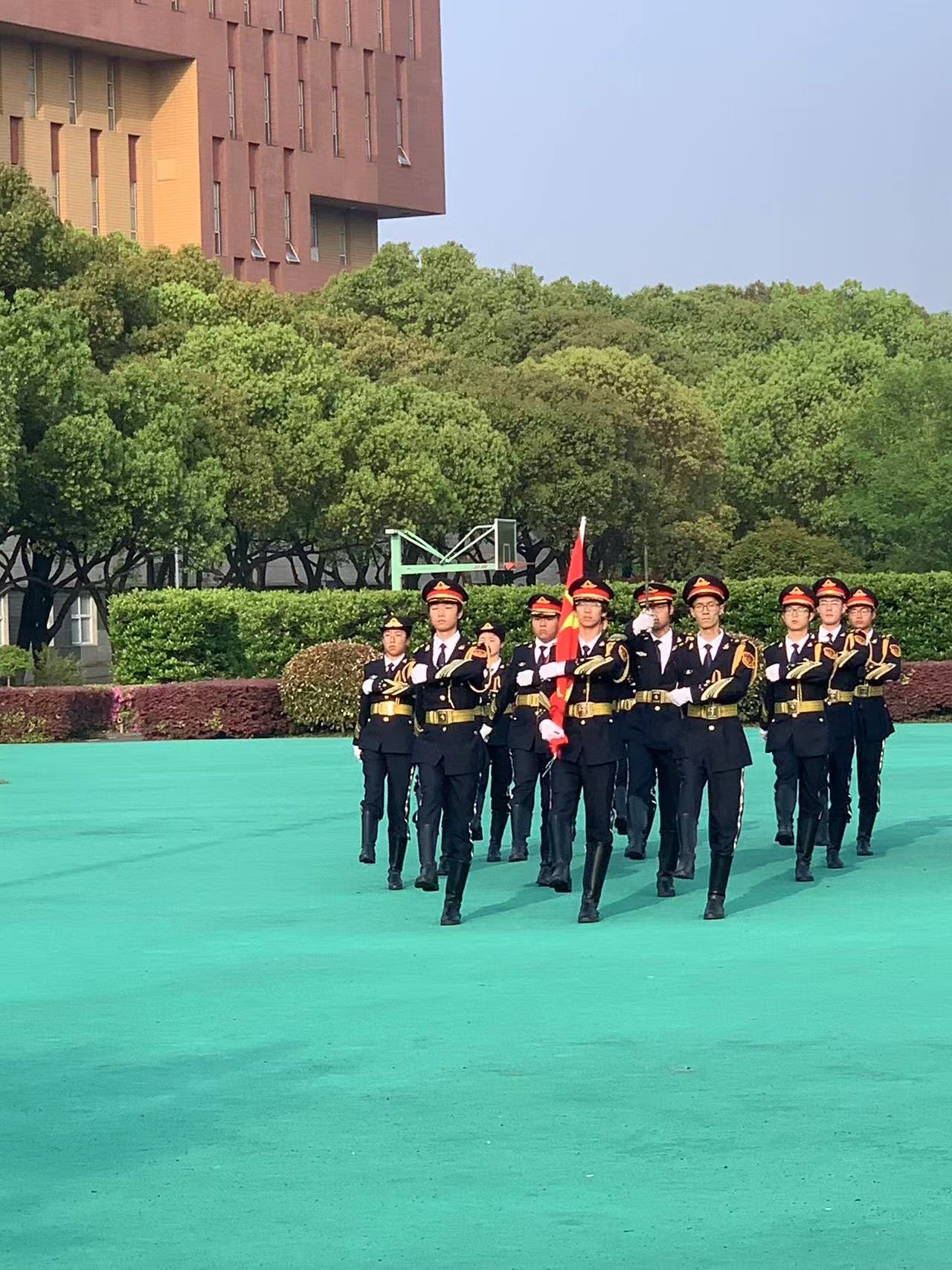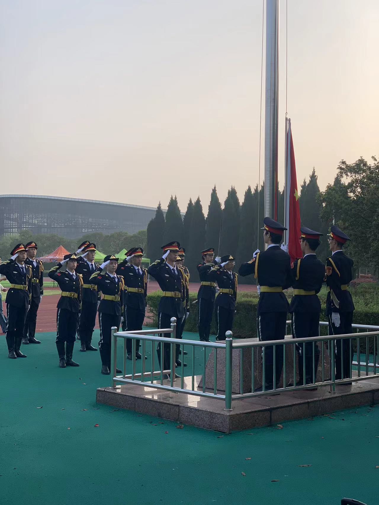 在学院师生的注目下,国旗护卫队的队员们迈着铿锵有力的步伐护送着国旗走向升旗台。伴随着国歌奏响,升旗手将国旗缓缓地升至顶端,全体师生肃立,面向国旗,向国旗行注目礼,唱国歌。