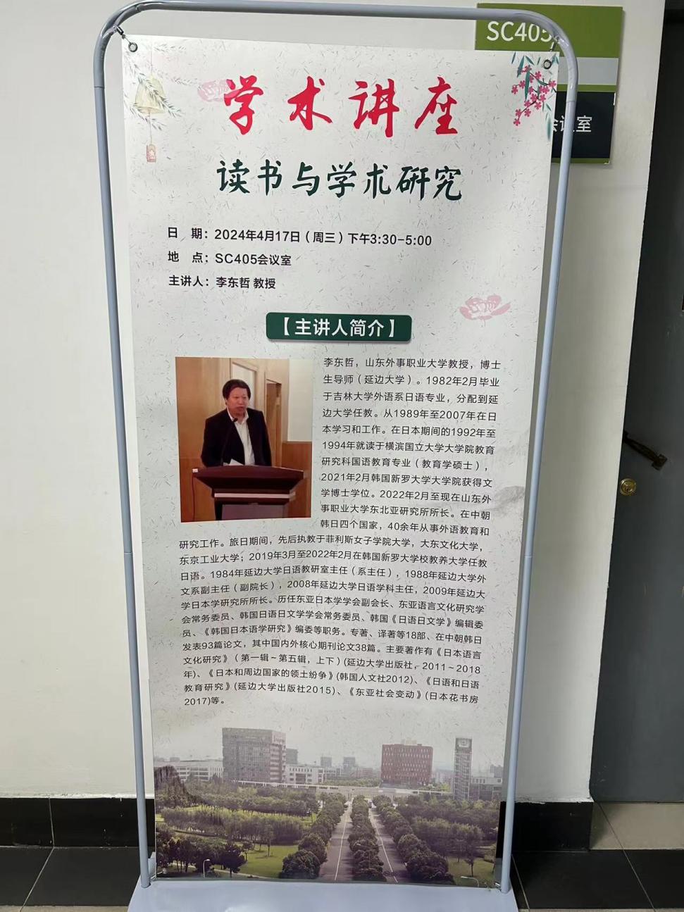 4月17日下午,东亚日本学研究学会会长李东哲教授为日语系师生做了题为“读书与学术研究”的讲座。本次讲座是外国语学院日语系和东亚文化研究中心共同策划并举办的。