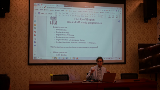 Małgorzata Fabiszak教授介绍了波兰密茨凯维奇大学的具体情况,并对我中心的工作表示肯定。接下来,双方就波兰暑期学生交换项目,硕士培养项目以及教师互访、科研合作等项目进行了初步交谈和探讨,同时分享了她在波兰文化及语言教学方面的研究心得,和与会多位教师达成了多项科研合作意向。这些合作计划不仅有助于提升双方在各自领域的学术水平,也将为我校波兰研究中心注入新的活力。