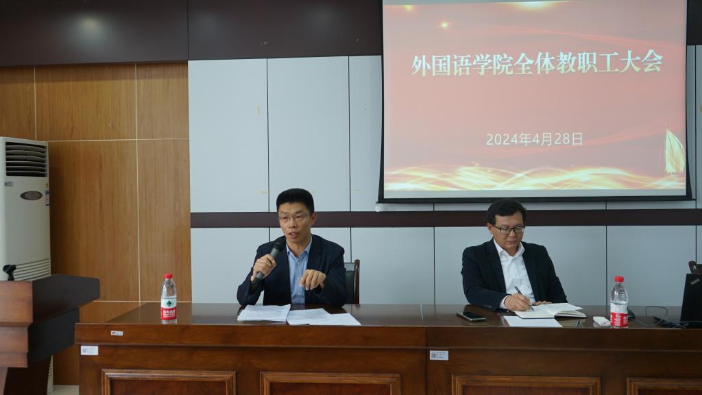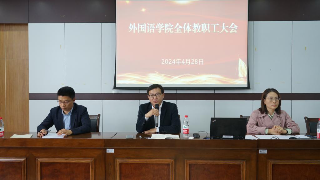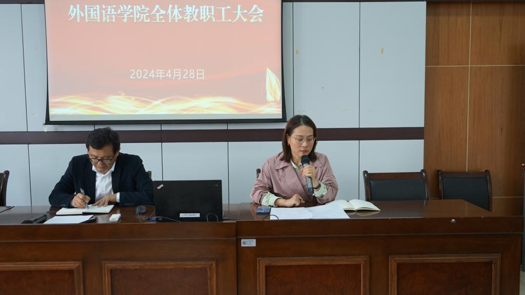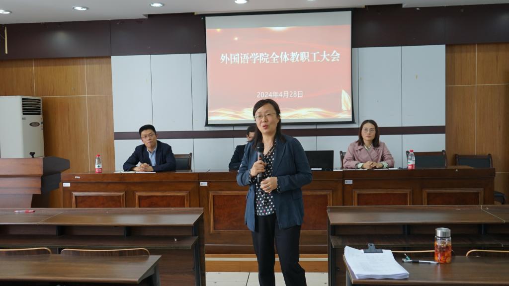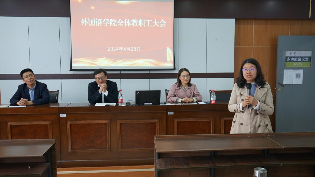 为深入学习贯彻党纪学习教育,扎实推进2024届毕业生高质量就业,安排部署学院年度重点工作,4月28日下午,外国语学院在SC405会议室召开2024年教职工大会。学院党政班子及全体教职工参加了大会,会议由学院党委书记刘群娣主持。