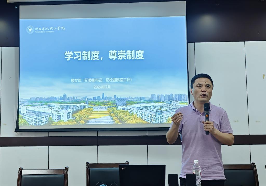 会前,学院组织了全体教职工会前“谈廉说纪”纪法教育活动暨清廉二级学院建设之“一道清风讲堂”报告,特别邀请了学校纪委副书记、纪检监察室主任楼文军作了“学习制度,尊崇制度”的专题报告。楼文军副书记通报了学校常见的违规违纪行为,通过具体案例带领全体教职工认识学习制度的重要性,并建议大家要充分了解学校相关规章制度,遇事主动报告报备,不要心存侥幸,强调所有教职工应知敬畏、存戒惧、守底线,时刻保持廉洁自律,将党纪法规要求转化为日常习惯和自觉遵循。