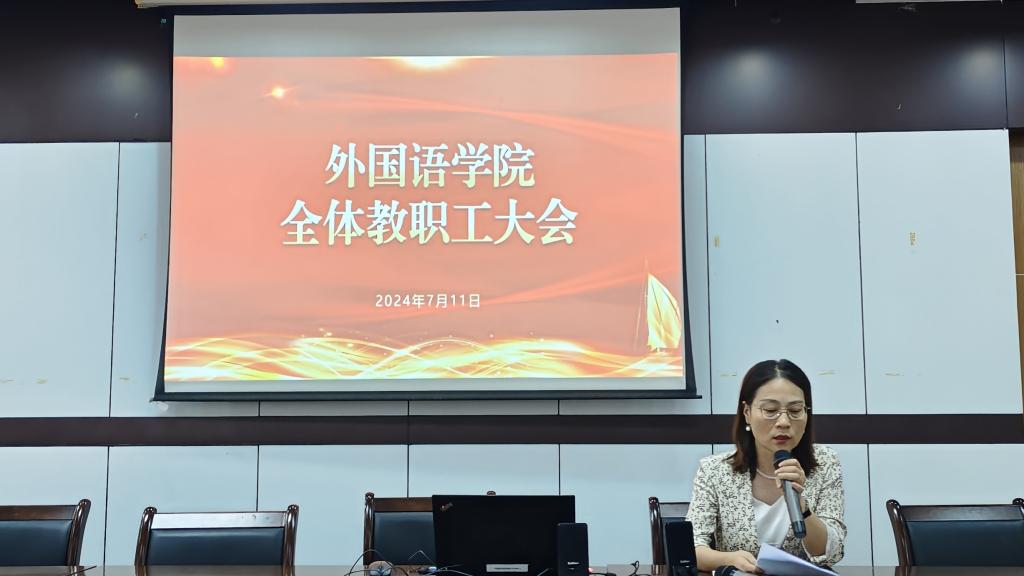 2024年7月11日下午,外国语学院召开了学期末全体教职工大会。学院全体教职工参加了会议,会议由学院党委书记刘群娣主持。