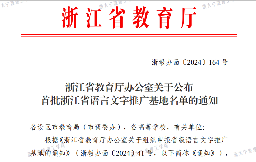 根据浙江省教育厅《关于首批浙江省语言文字推广基地的公示》,经自主申报、材料审核、项目论证、实地考察等程序,我校已成功入选首批浙江省语言文字推广基地。