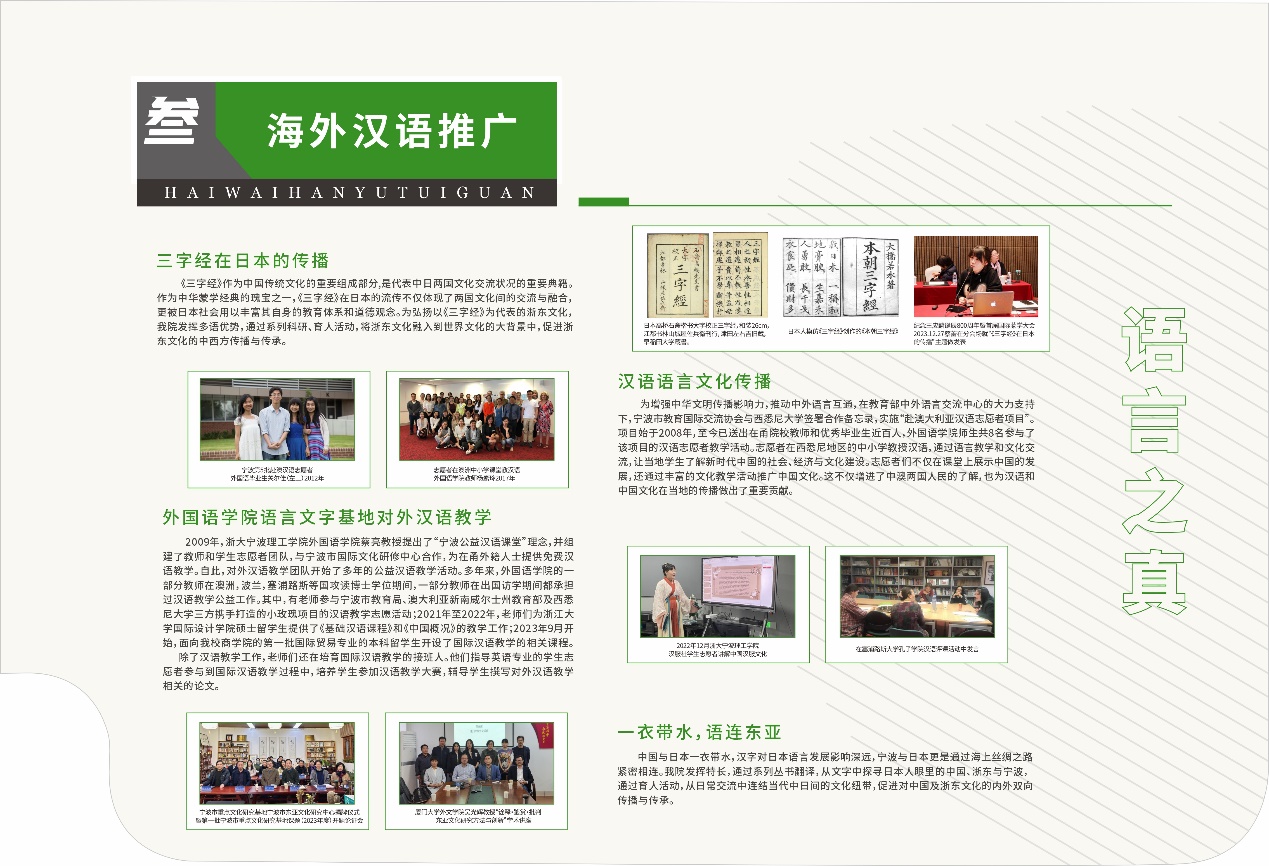 近年来,我校在全面贯彻落实党和国家语言文字工作战略方针的同时,也不断挖掘和转化宁波优秀的历史文化资源,聚焦中国语言文字“知识传承”、“文化传播”和“精神传递”三个方向,形成了中华经典传承、国际中文教育、浙东文化国际传播、方言资源保护、语言文字美育、语言数字传播、语言认知科学等专业团队。此次申报的成功,是我校近年来语言文字推广与文化传播工作成果的集中展现。