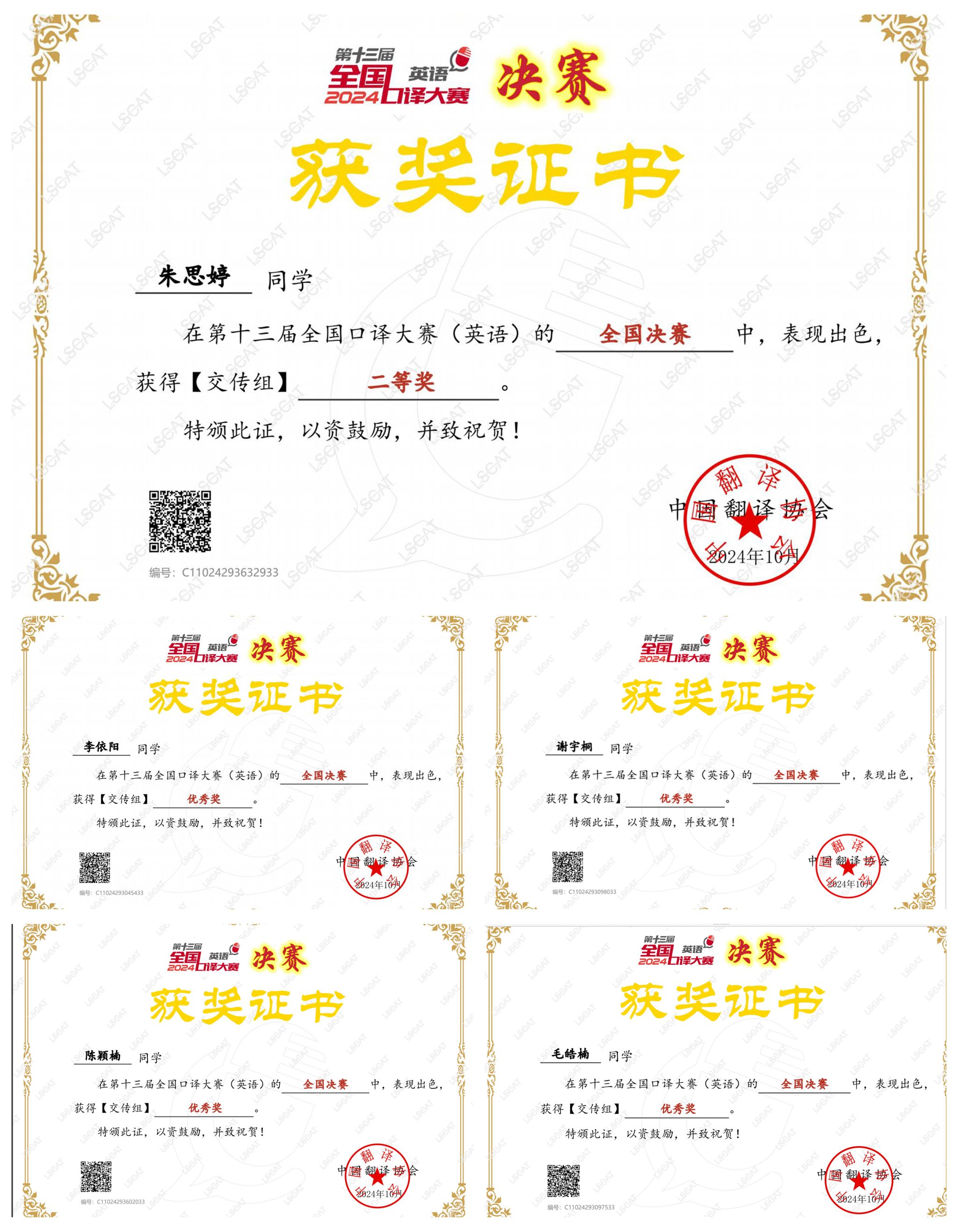 本届全国口译大赛于今年3月启动,采用省级初赛、省级复赛、全国决赛三级赛制。我校选派的14名选手中共有12位晋级省级复赛,其中陈颖楠同学获得省级复赛一等奖,朱思婷、毛皓楠、谢宇桐和李依阳等四位同学获得二等奖,张忆天、张淑婷、柳雨欣、李缘缘、章若煊、郑涵旭、邱子轩等七位同学获得三等奖。获得复赛一、二等奖的五位优秀选手顺利晋级全国决赛,在学院老师的指导下,积极备战,最终朱思婷同学荣获全国二等奖,全国排名第169名,创历史最佳成绩,李依阳、谢宇桐、毛皓楠、陈颖楠等四位同学荣获全国优秀奖。