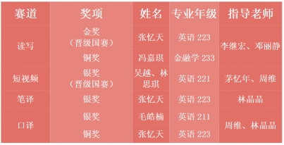 近日,第二届“外研社·国才杯”“理解当代中国”浙江省大学生外语能力大赛圆满结束。我校39名学生参加了演讲、读写、笔译、口译、多语种、短视频六大赛道,与来自近百所省内学校的千余名选手同台竞技,奋力拼搏,发挥出色,最终斩获金奖1项,银奖3项,铜奖2项,其中外国语学院张忆天、吴越和林思琪同学将代表浙江省赛区参加全国总决赛。