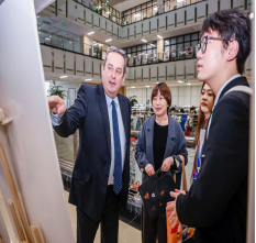 展览参观结束后,总领事先生意犹未尽,在工作人员的引领下,前往我校另一场文化盛宴—“宁理看世界国际文化节”波兰展位前。展位以其鲜明的波兰元素和浓厚的文化氛围,再次吸引了总领事先生的目光。总领事先生用流利的汉语热情地与周围每一位同学打招呼,鼓励同学们继续学习和探索波兰的语言与文化。
