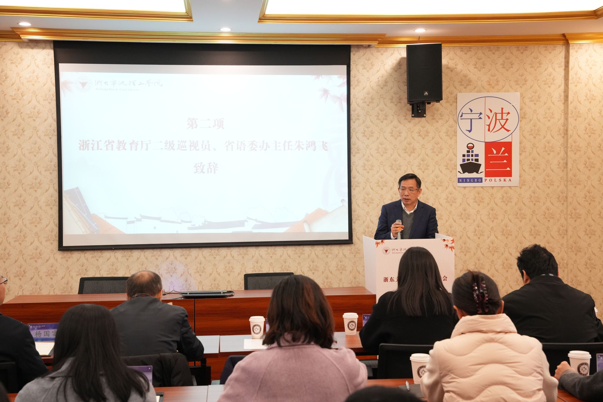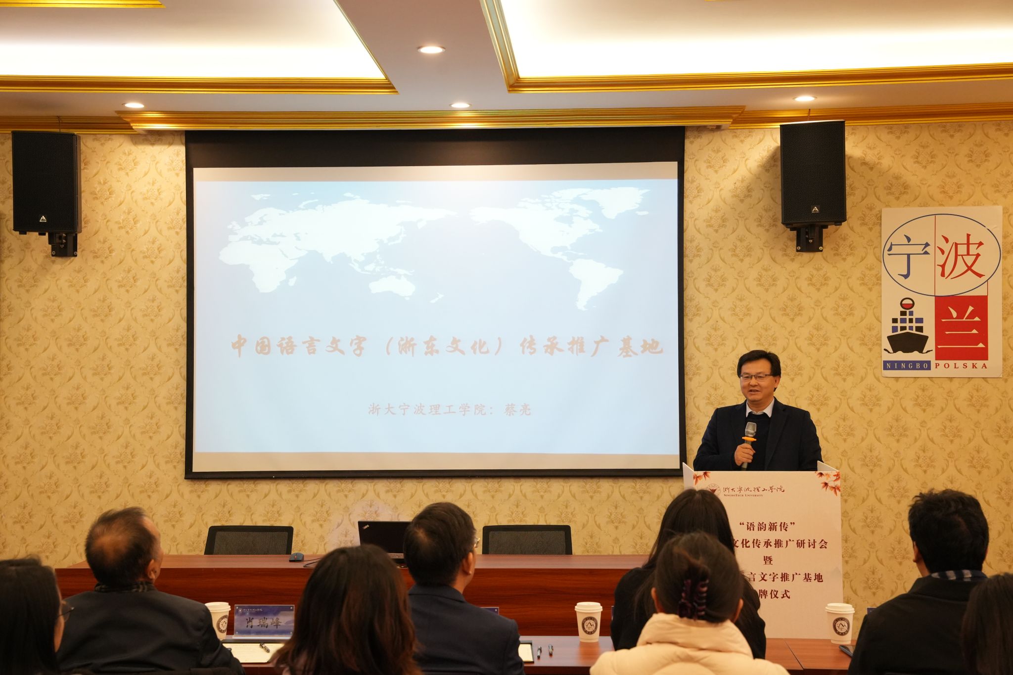 为推进国家通用语言文字推广普及和浙东文化传承发展,助力我校省首批语言文字推广基地建设,12月13日下午,学校举行“语韵新传”浙东文化传承推广研讨会暨省首批语言文字推广基地(浙大宁波理工学院)成立仪式。浙江省教育厅二级巡视员、语委处处长朱鸿飞,浙江工业大学人文学院教授肖瑞峰,宁波市教育局基教处副处长张苗妙,浙江工业大学人文学院院长张晓玥,宁波大学人文与传媒学院教授肖萍等专家学者受邀出席,学院党委副书记杨国富、宣传部部长江美芬,相关学院、部门负责人以及基地全体成员参加了会议。