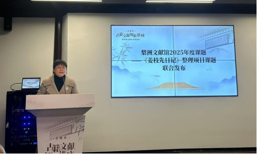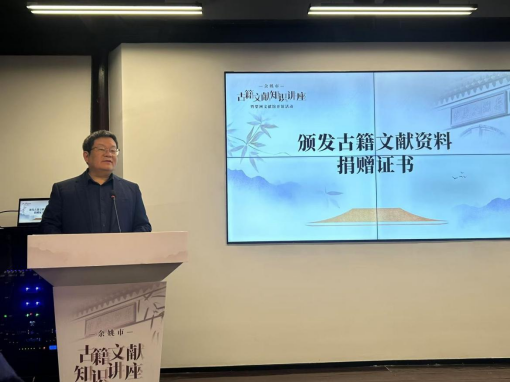 本次馆校合作签约挂牌仪式恰逢梨洲文献馆(余姚地方版本馆)开馆活动。梨洲文献馆是浙江省首家县级地方文献馆,共展出古籍60余件/套、雕版8件/套、信札资料30余件/套,民俗家具70余件/套,图书300余册。活动现场,不少专家学者为文献馆捐赠古籍。李军局长为宁波财经学院人文学院副教授邹建峰、余姚市看云楼科举文化博物馆馆长褚纳新、新岙孙氏宗谱编委会主任孙乾根颁发了捐赠证书。市档案馆副馆长楼洁芳女士宣布发布梨洲文献馆2025年度课题——《姜枝先日记》整理项目。浙江图书馆副研究员陈谊博士作了题为“人与书:浙江历代藏书家举隅”的讲座。
