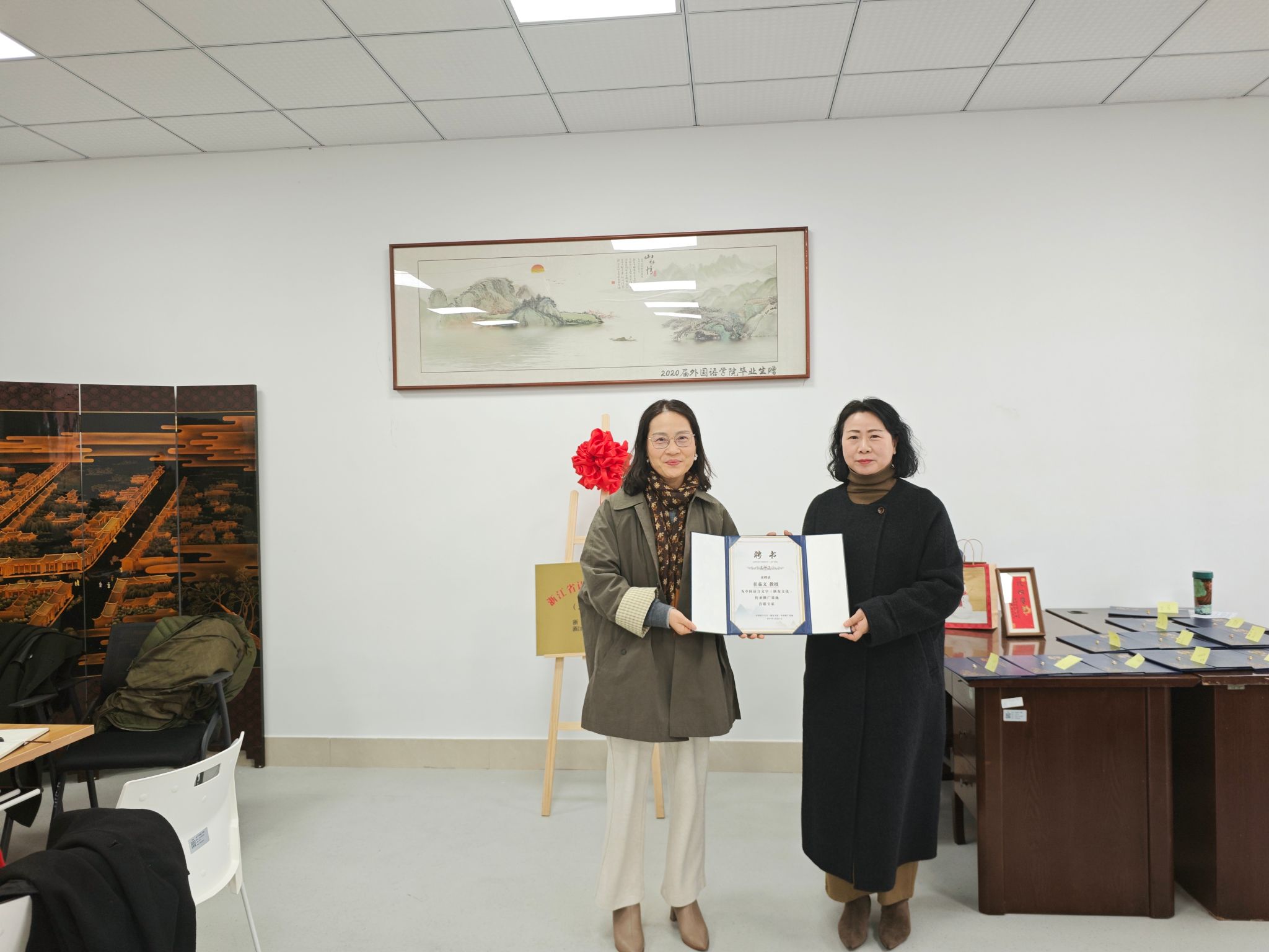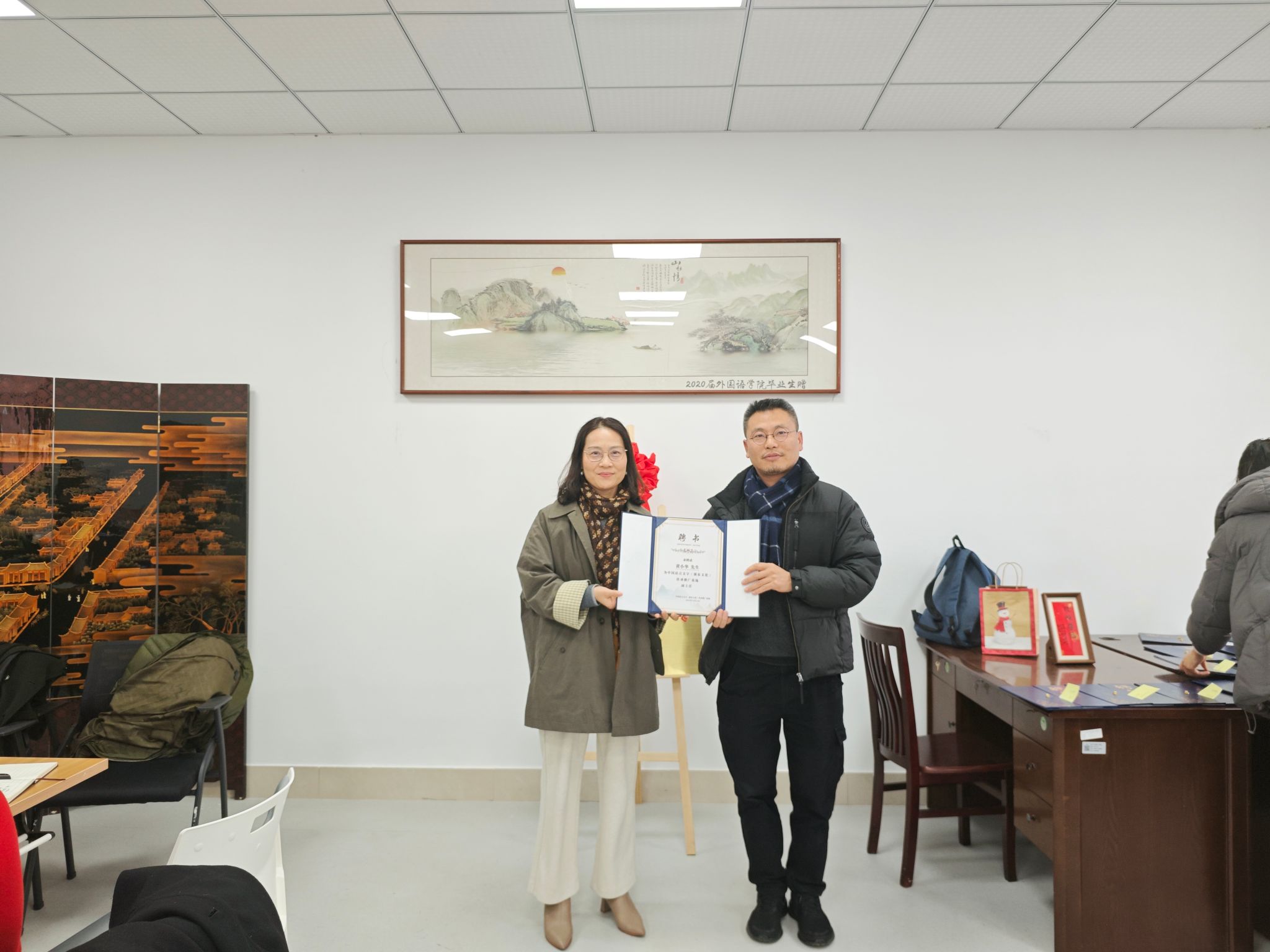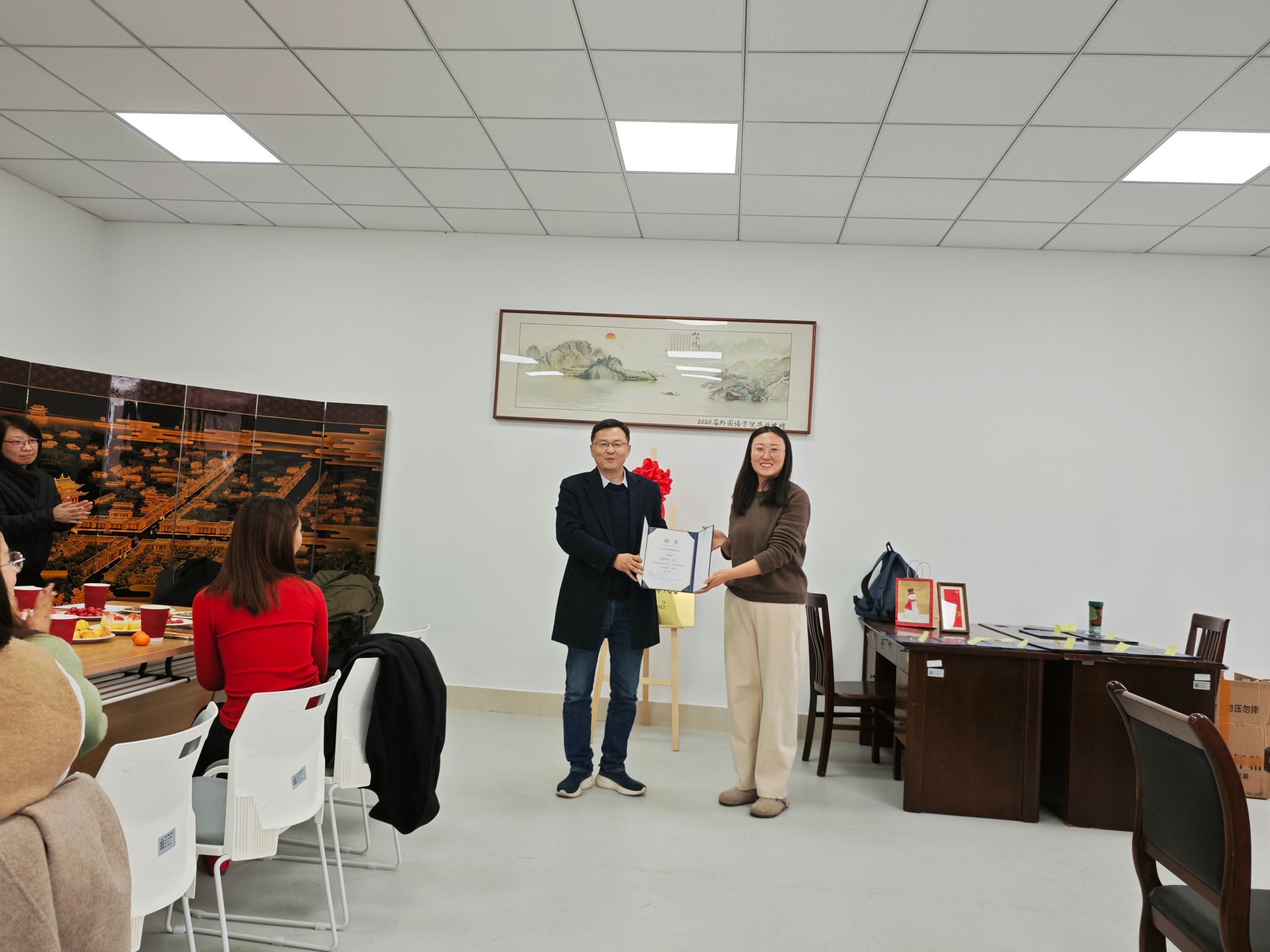 会议伊始,基地执行主任蔡亮首先对来自不同学院的基地成员表示了热烈的欢迎,对基地成员在省级语言文字推广基地申请工作中的辛苦付出和通力合作表示感谢。随后,外国语学院书记刘群娣和基地执行主任蔡亮为基地成员颁发了基地聘书。