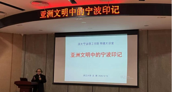 讲座中,浙江大学亚洲文明研究院副院长、求是特聘教授王勇以《亚洲文明中的宁波印记》为题,先从宁波的重要地理位置和日本奈良曾举办过的“圣地宁波展”出发,说明了自唐朝以来宁波作为国际港口在东亚历史中的重要作用,并列举了中日两国当时通过宁波市舶司进出口的各类货物,指出宁波是当时东亚物流枢纽。他又从古代宁波和博多的交流,日本人对宁波的恋地情结,纲首与工匠的中日交流等不同角度,对亚洲文明中的宁波进行了深入阐述。