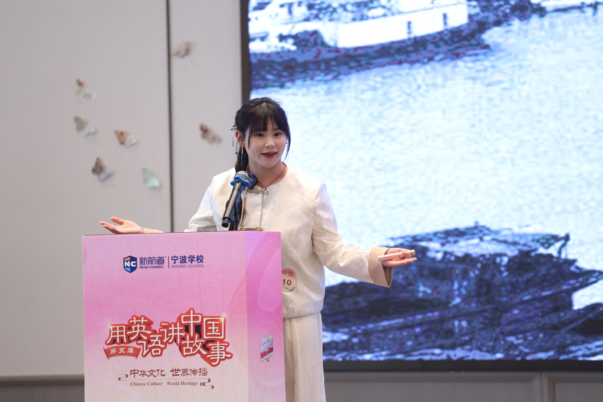 孙舒逸同学讲述了宁波港起源于春秋时期的勾章港,渔夫Leo带领水手护港,其展现的协作精神作为港口文化基石,见证港城的蓬勃发展和独特魅力。