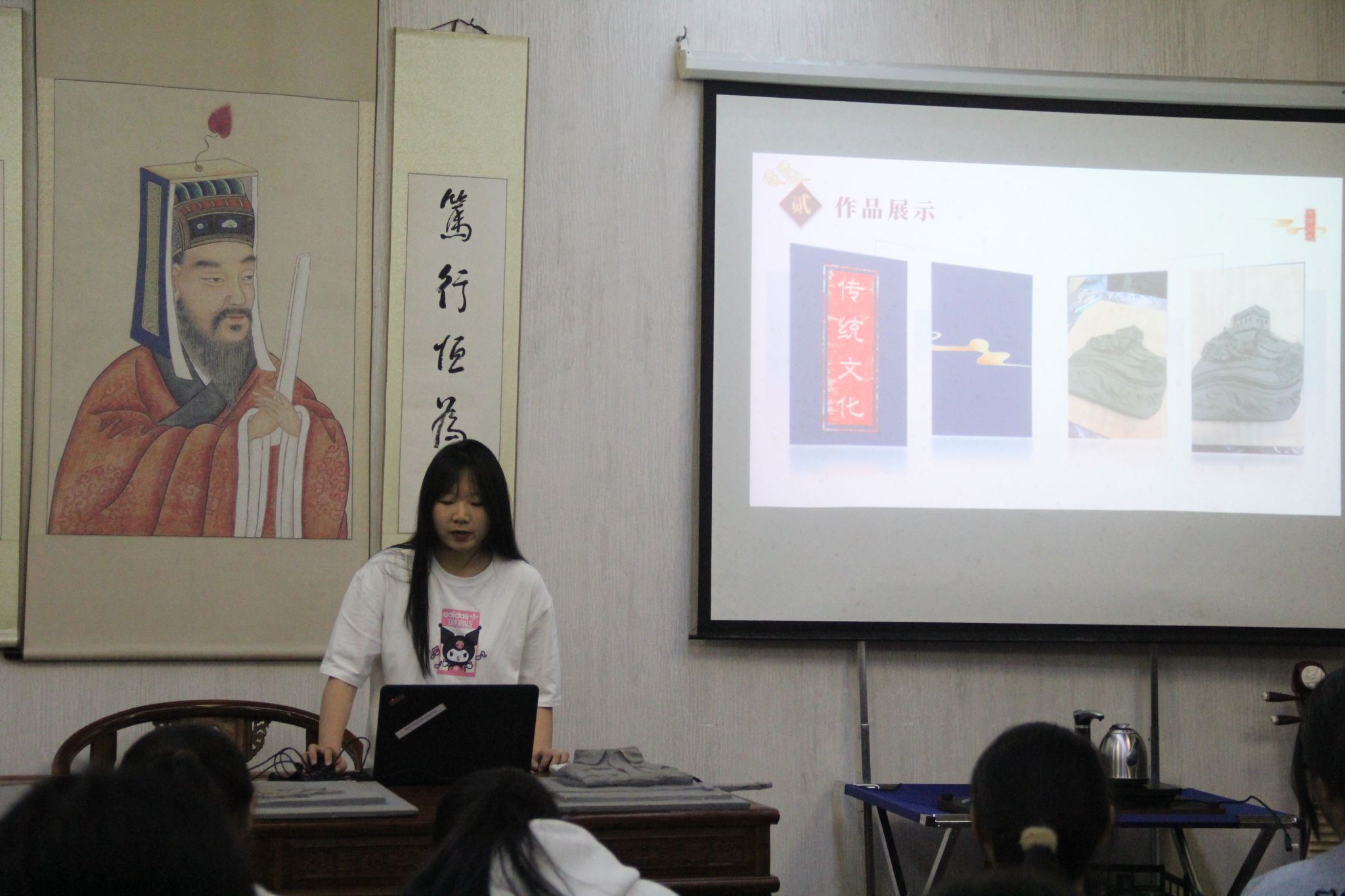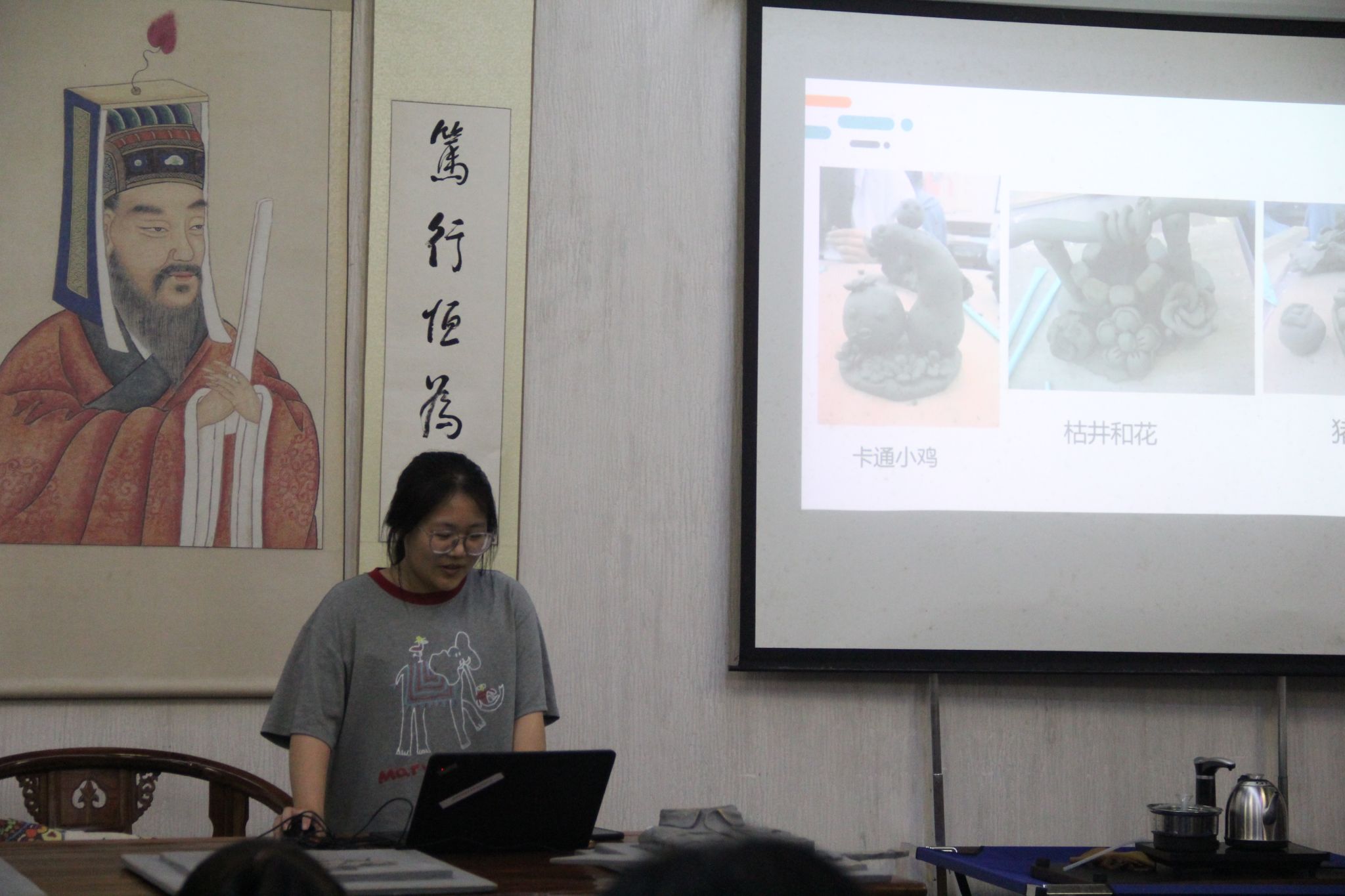 结课典礼依照既定流程有序进行,共安排了四项议程。首先,进入作品成果展示环节,学生们通过精心准备的PPT,在2至3分钟内依次展示了各自的泥塑作品,并分享了在学习过程中的心得体会。在塑造泥土形态的过程中,学生们不仅掌握了技艺、实现了自我成长,还深入与泥土对话,揭示了其中蕴含的艺术价值。