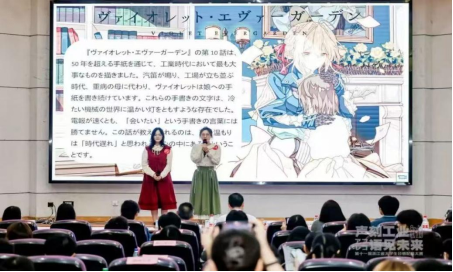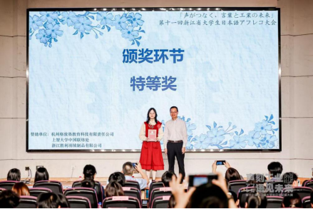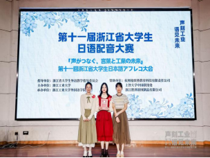 浙江省大学生日语配音大赛由浙江省外语教学指导委员会与浙江工业大学联合主办,是省内最具权威性的日语综合类竞赛。参赛选手们围绕“声刻工业·语见未来”的主题展开激烈角逐,比赛分为团队介绍及工业主题阐释、原声影片配音两个部分,评委从语音语调、情感表达、团队合作、难易程度等方面进行综合评审。我校学子选取了工业文明背景下的经典番剧《紫罗兰永恒花园》作为配音片段,通过细腻的情感把握和精准的语音控制,将剧中人物在机械文明中追寻人性温暖的心路历程演绎得淋漓尽致。她们富有张力的声线表现和天衣无缝的配合,多次引爆现场掌声,最终以显著优势拔得头筹。