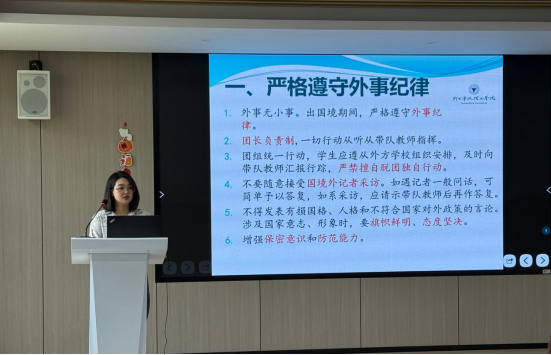赵远老师从外事纪律、出入境注意事项、安全防范意识、领事保护意识、行前材料准备等多个维度进行了细致的讲解。针对当地政策、国际形势、人身安全等方面,提醒同学们要时刻保持警惕,确保个人安全。同时,鼓励同学们在体验当地文化的同时,加强学习,提升跨文化交流能力与国际竞争力,争取在交流活动中不断充实自我,实现个人的全面提升。