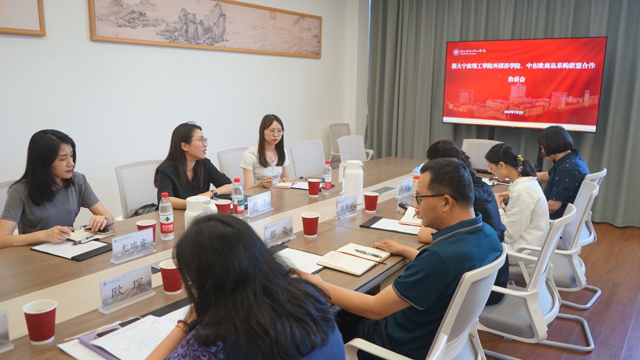 学院院长蔡亮介绍了学院基本情况、专业特色、产教融合规划以及目前学院与企合作的模式与成功案例,并提出了学院与联盟的合作构想。双方就人才培养、实习实践、产业学院、中东欧文化传播等方面展开交流。