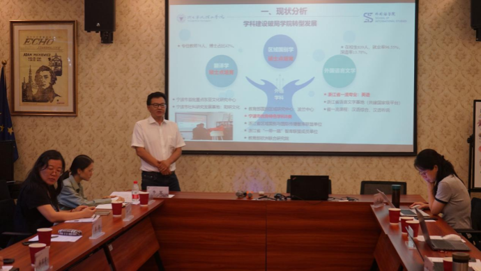 在汇报交流环节,学院领导班子成员、平台负责人、系部负责人分别就党建引领学科发展、学科平台建设、硕士点申报、教学成果奖申报、创新创业等工作进行了汇报。随后,学院执行院长蔡亮作了外国语学院“十五五”发展规划初步思路的汇报,明确了未来五年学院发展的战略方向与重点任务。