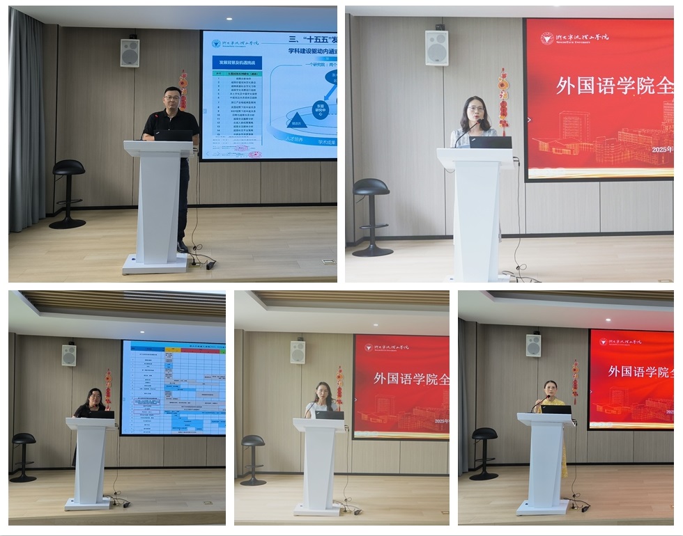 为明确新学期工作方向,凝聚学院发展合力,2025年9月30日,外国语学院在SC405教室召开2025-2026学年第一学期全体教职工大会。学院党委书记刘群娣主持会议,执行院长蔡亮、副院长欧琛、林晶晶,副书记项安玲及全体教职工参会,会议围绕安全稳定、学科建设、人才培养、科研外事、学生工作五大核心板块展开系统部署。