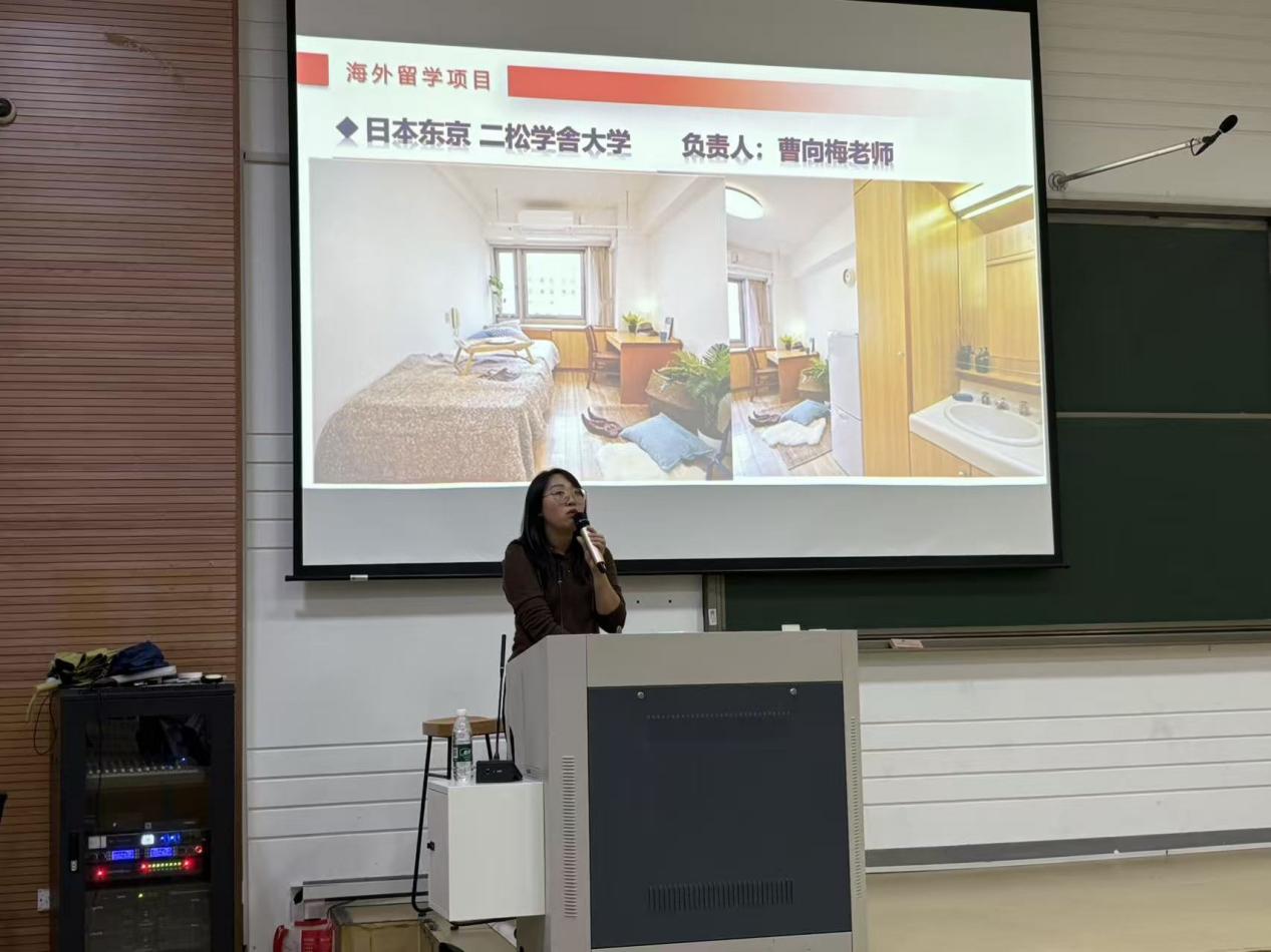 大会第三部分,谢展眉老师为同学们带来了关于海外交流与职业发展的实用信息。她首先介绍了日语专业目前开展的各类交换留学项目,为同学们规划海外学习经历打开了视野。接着,她就外国语学院及日语专业近年来的毕业生就业率、就业单位类型以及毕业去向分布等情况进行了简要说明,展示了日语专业良好的就业前景。