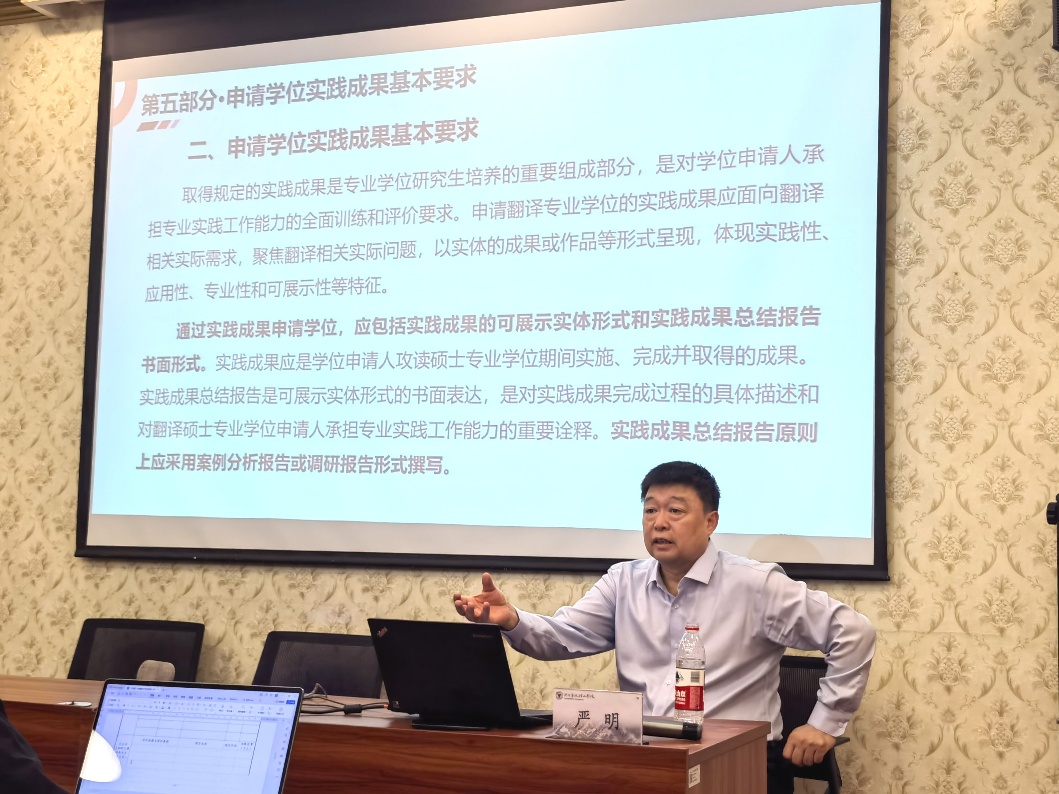 报告高屋建瓴,对于翻译学科硕士点的申报以及建设具有极强的指导意义。报告中,严教授特别强调了学术型与专业型两类学位的同等重要性、分类培养全链条、产教融合运行机制、协同育人的生态与机制、双导师制/导师组机制、融合人工智能与技术赋能、“三位一体”的办学定位、“四个方面”的素养、实践能力培养、师资队伍建设与基层教学单位的建设,以及教学质量保障机制等核心问题,让我们更清晰地了解翻译学科建设与人才培养的目标,即注重与培养专业实践工作的能力、在专业实践领域作出创新性成果的能力,为国家培养高层次应用型专业化的翻译专门人才。