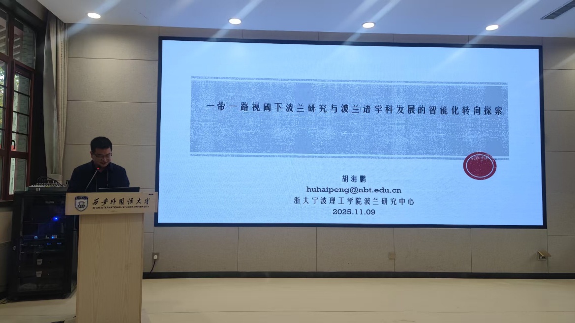浙大宁波理工学院波兰研究中心副主任胡海鹏副教授受邀出席大会发言,题为《“一带一路”视阈下波兰研究与波兰语学科发展的智能化转向探索》。胡老师从国家战略与学科建设的双重视角出发,系统阐述了在“一带一路”倡议的引领下,中国与中东欧国家,尤其是波兰,在经贸往来、文化交流与教育合作等领域的最新进展,并深入探讨了人工智能技术在波兰研究与波兰语学科发展中的融合应用与创新路径。
