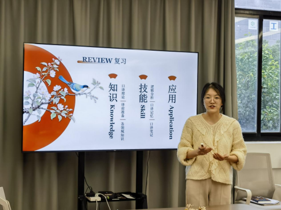 分享环节后,周维老师以本届浙江省高校青年教师教学竞赛为模拟场景,围绕其参赛课程《口译》,选取“成语翻译”这一主题,进行了20分钟的现场教学展示。在展示过程中,周维老师教态自然,语言流畅,教学内容安排紧凑,逻辑层次清晰,充分展示了其扎实的专业功底、精湛的教学设计能力以及良好的课堂驾驭能力,生动呈现了口译教学的魅力与深度。此外,周维老师还对其参赛课程中的另外四个作品进行了简要的介绍与亮点展示。