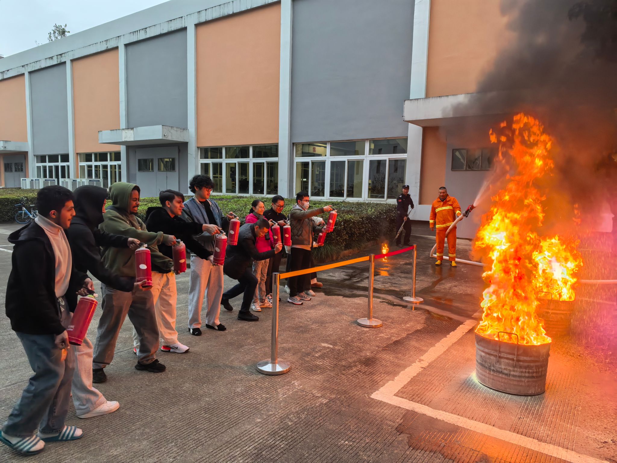 为切实增强师生消防安全意识,提升应急避险与自救能力,2025年11月24日下午,外国语学院与国际教育学院联合组织开展消防疏散演练活动。本次演练在外语实验室模拟火情逃生和灭火实战演习。