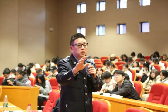 本次宣讲由钟公庙派出所刑侦中队副队长邹鸣、辅警周磊主讲,主会场设于启新大讲堂。同时,在校园人流量较大区域同步开展互动问答,形成“双线联动、全域覆盖”的教育宣传格局,在提升宣讲实效的同时,增强教育的趣味性和参与度。