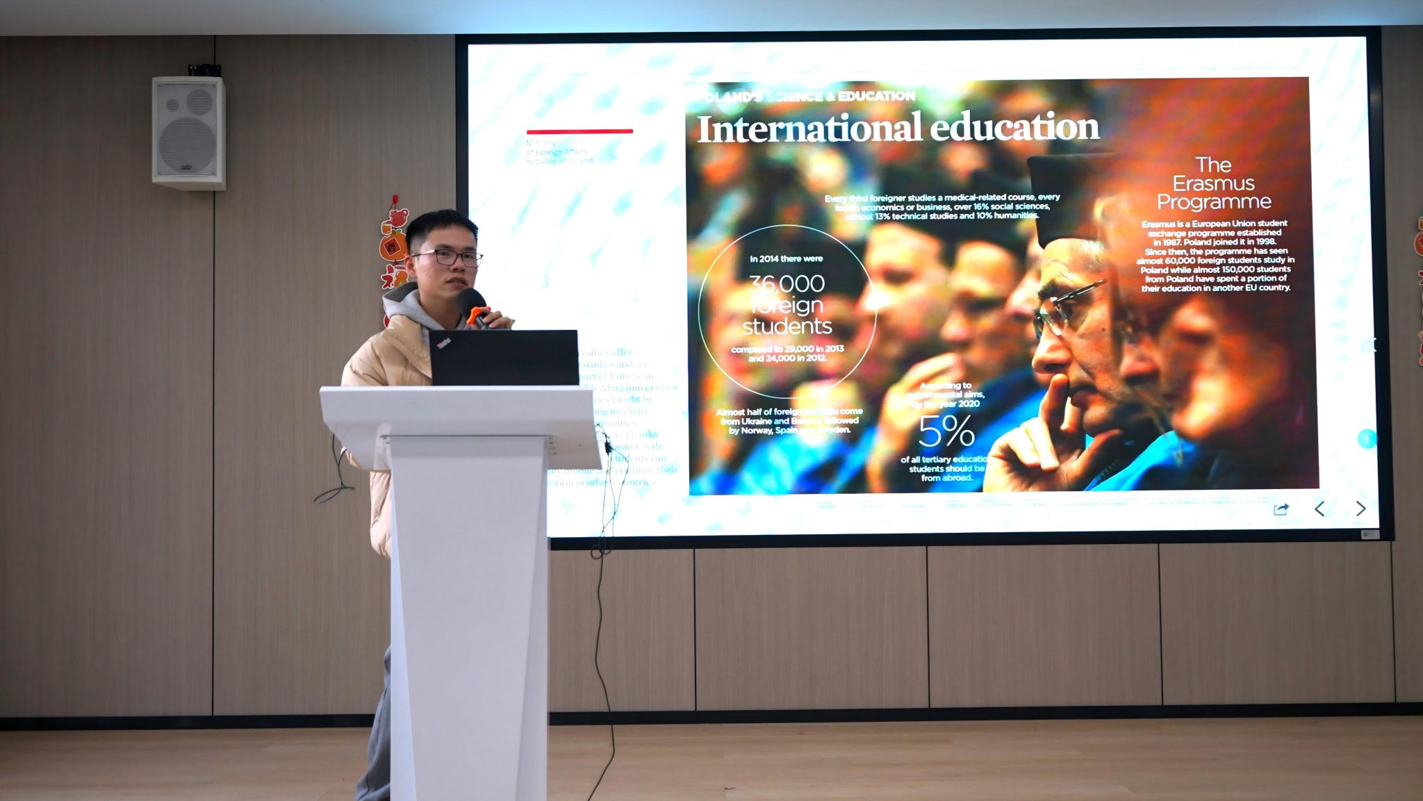 参与2025年暑期波兰项目的戴玮岚同学分享了她在密兹凯维奇大学的所见所闻。她以生动活泼的语言描述了学习生活、文化碰撞与跨文化友谊,让在场同学对海外访学有了更直观、真切的感受。