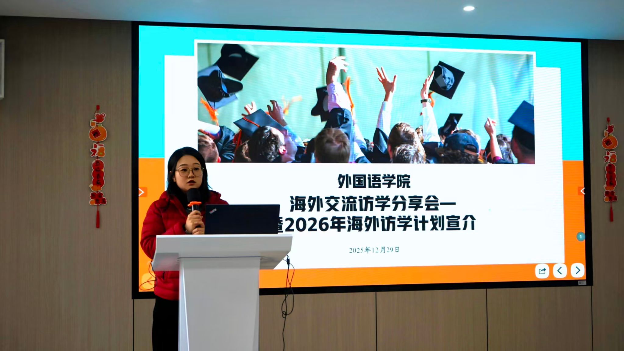 为开拓对外交流锻炼机会,拓宽学生国际视野,进一步激发学生出国访学热情,12月29日下午,外国语学院召开了2026年暑期海外访学计划团组宣传介绍会,团组负责人、学院教师邓凌志、吴虚怀,党政办外事秘书赵远,访学归国学生代表戴玮岚等参加了会议。