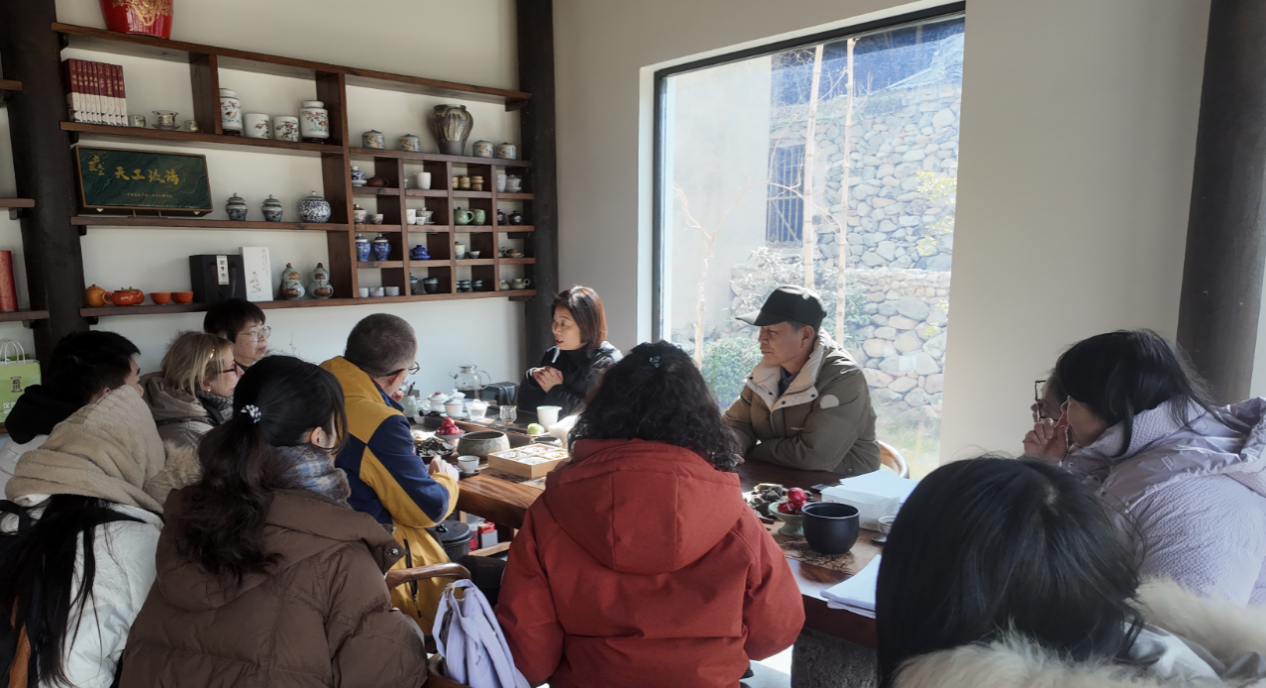 抵达葛家村后,调查组跟随葛万永书记拜访了乡村CEO葛海娟女士。在座谈交流中,葛总详细介绍了村落医康养产业的整体规划与发展布局,从与高校、专业机构合作推进“药师同源”技术转化,到香樟、艾草特色产业链打造;从青年疗养院规划落地到联动周边资源汇聚客流、实现流量转化,全方位展现了葛家村以医康养为核心,推动三产融合、构建可持续发展生态的探索与实践。调研团队结合葛总的介绍,就葛家村产业发展、经营运营现状作了进一步交流探讨,并依托外国语学院的学科特色与资源优势,围绕葛家村医康养品牌建设及国际传播,初步提出了针对性合作思路。双方就发挥学院外语专业、外籍教师及国际交流平台优势,搭建多语种宣传渠道、讲好葛家村康养故事,助力本土康养产业发展,共建大学生实践基地、组织师生参与村落业态运营、品牌翻译和新媒体传播等具体事项达成共识,为后续校村深化合作明晰了工作方向。