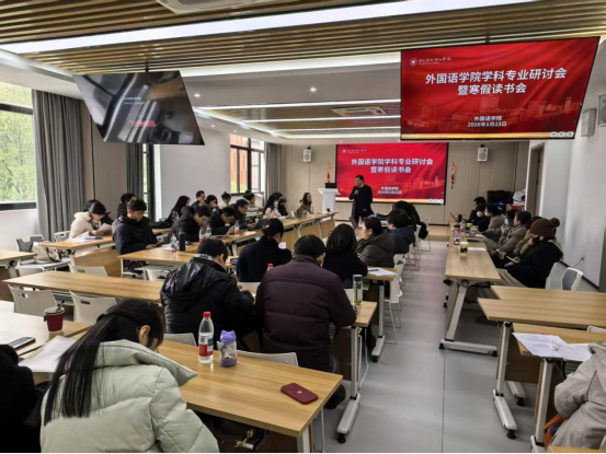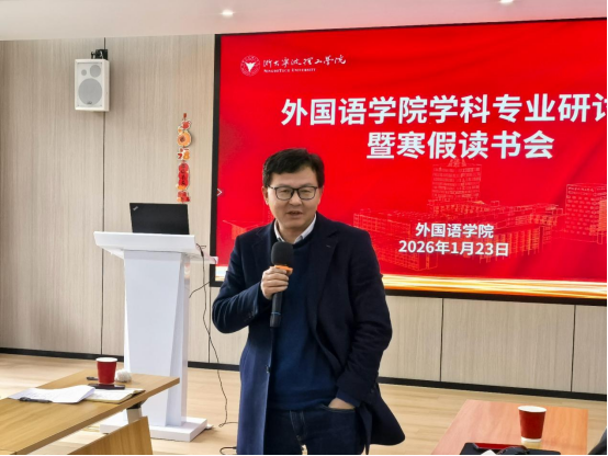 2026年1月23日上午,外国语学院在SC405会议室成功举办学科专业发展研讨会暨领导班子寒假读书会。会议以“聚焦学科发展,共谋专业未来”为主题,围绕英语、日语等学科的专业建设、区域国别转型、人才培养与学科融合等议题展开深入研讨。学院领导、系负责人及骨干教师参加会议。会议由学院党委书记刘群娣主持。