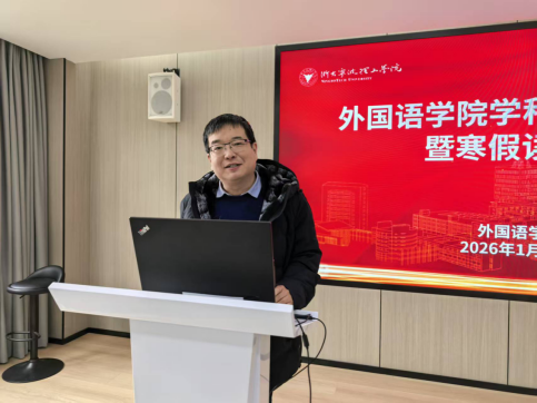 蔡亮院长在总结讲话中系统梳理了学院近年来的转型历程与发展挑战。他指出,面对人工智能冲击与社会认知变化,外语学科必须主动突围,以区域国别学为核心方向,推动学科交叉与融合创新。学院将以宁波“港口城市”为地域依托,整合东亚文化研究、波兰研究、港城文明互鉴等特色方向,持续深化校企合作、课程重构与师资转型。蔡院长强调,2026年学院将重点推进区域国别研究院实体化运作、硕士点申报、智库建设、教材开发及“外语+产业”国际班等项目,希望全体教师同心同向、积极作为,共同推动外语学科实现高质量发展。