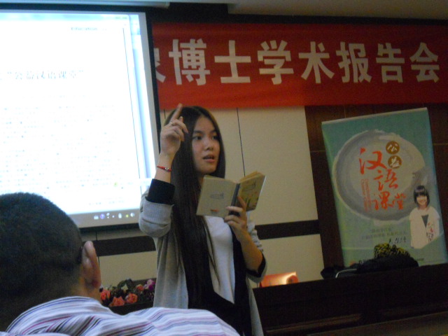 随后上场的陈凝玲、王爱清和张佳能同学谈到了自己在教学中的经验。比如陈凝玲同学就提到外国人很难发中文的第二声,所以她改变了教学顺序,先让外国人发第一声、第三声和第四声。而发第二声的时候,她选用和两个字合在一起读的方式,第一个字如果是第一声或者是第四声,第二个字发第二声会比较容易。陈凝玲表示老外学中文劲头十足,非常认真,像一个个好学的小学生,他们会主动向志愿者们提出问题。比如就有老外问过,“‘你’不是读第三声的么,那为什么‘你好’的‘你’声调变成了第二声呢?”当时,她被老外的问题震住了,仔细品位后回答:发现凡是两个或多个第三声的字组合在一起,第一个字通常都发第二声。