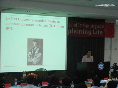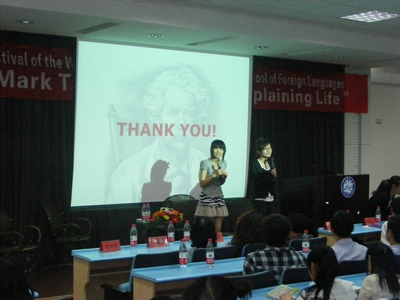 叶琴法副院长在开幕致辞中提到名人周这样的学术活动在培育校园文化、提高同学们人文素养等方面发挥了重要作用,也为广大的师生提供了学以致用的平台和机会。他希望我们能在马克. 吐温的文学作品中,寻找内心的启迪和生命的感怀,从马克吐温的幽默中看人生百态,感知他的生命情怀,共同走进我们心中的马克吐温。