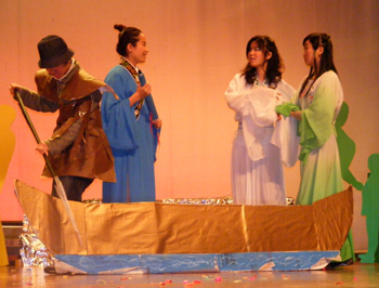 在活泼的开场曲《Jungle Bell》过后,精彩纷呈的外文短剧一一上演。由05英语1班选送的简奥斯•汀的名作——《傲慢与偏见》向我们展现了女主角伊丽莎白的美丽与自尊,随后06英语3班饰演的根据流行美剧《绯闻女孩》改编的《Two Necklaces》则让我们感受到了浓浓的青春的气息。这时,一曲再熟悉不过的《千年等一回》将大家的思绪陡然带回了孩提时代百看不厌的电视剧《白蛇传》。断桥、残雪、雷峰塔……在这一幕幕似曾相识的场景中,来自05英语4班的同学为我们演绎了这一经典之作。而来自05英语6班的同学则为我们带来了莎士比亚的著作——《哈姆雷特》,“To Be or Not to Be ”的经典诗篇,让我们深深感受到主人翁在面对抉择时的无奈和文艺复兴时期知识分子对人生的思考。